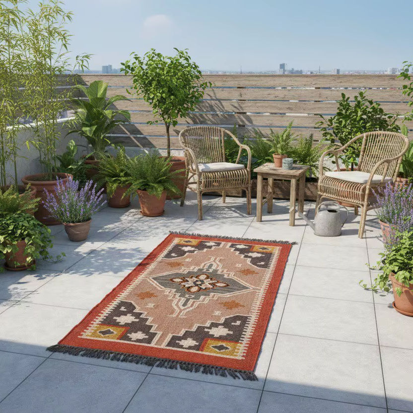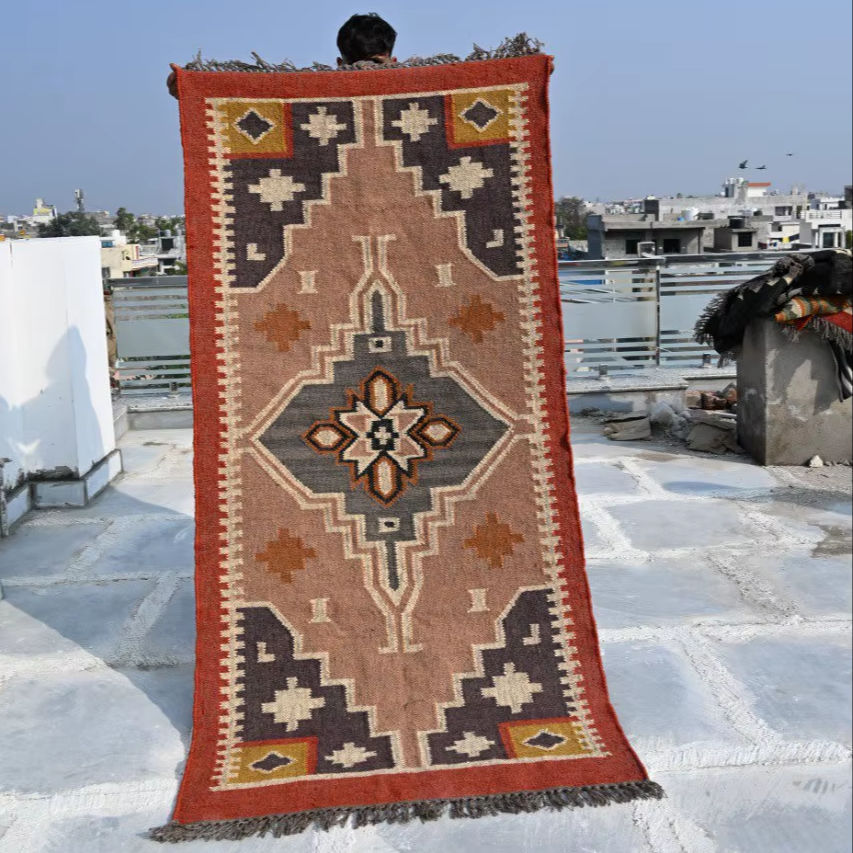 Alfombra Kilim de Yute y Lana Hecha a Mano - Patrón Geométrico, Lavable, Ecológica, Color Personalizable, para Picnic y Uso Doméstico