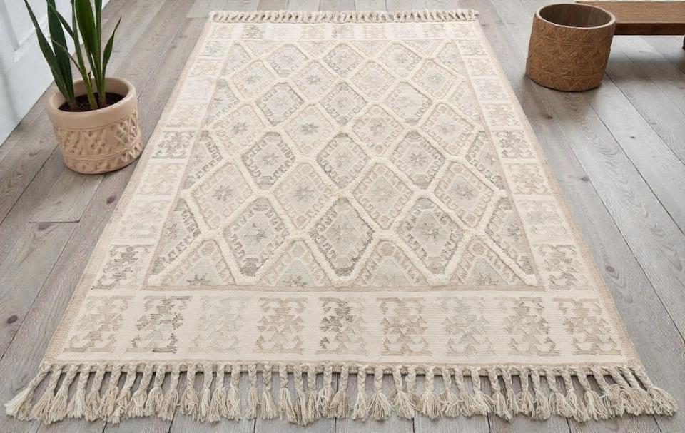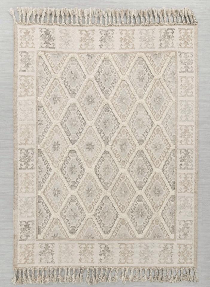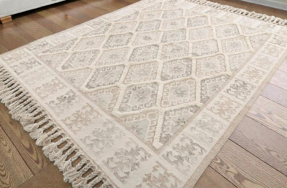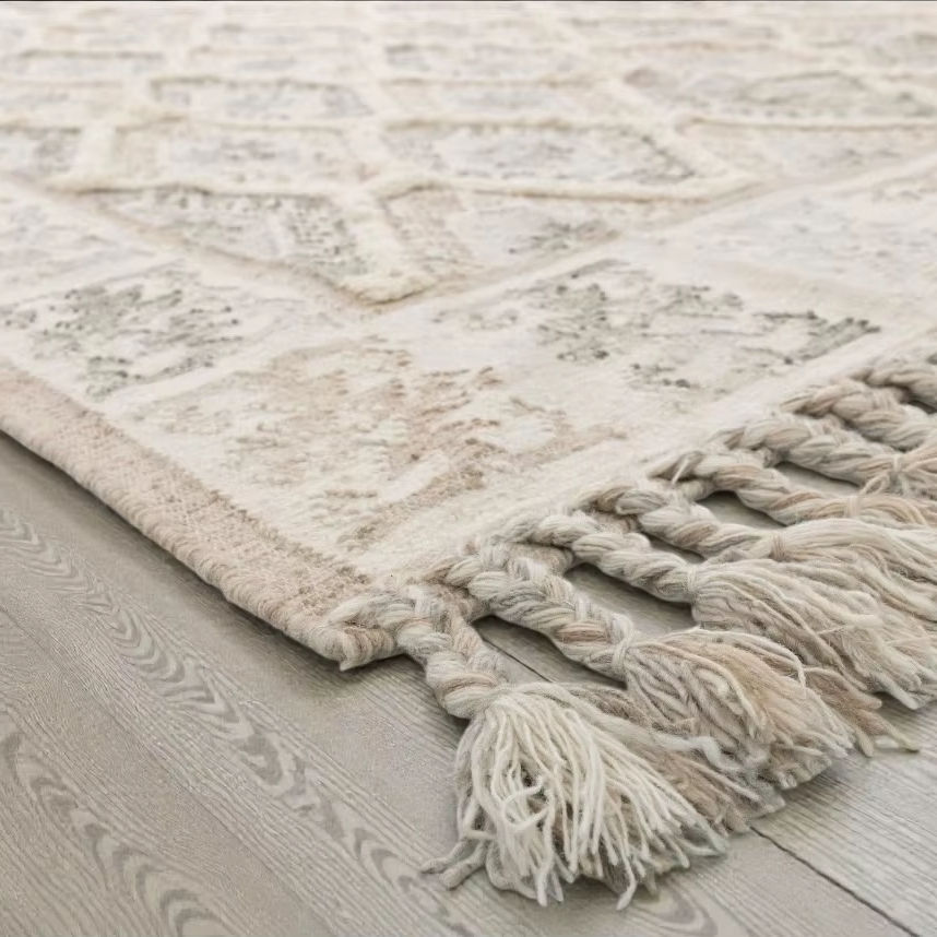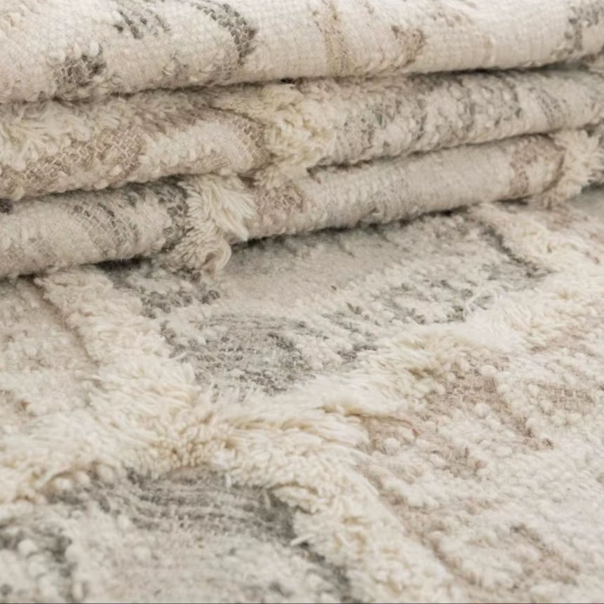 Alfombra de Yute y Lana Hecha a Mano con Patrón Abstracto, Ecológica, de Pelo Corto, Color Beige Natural, con Borlas