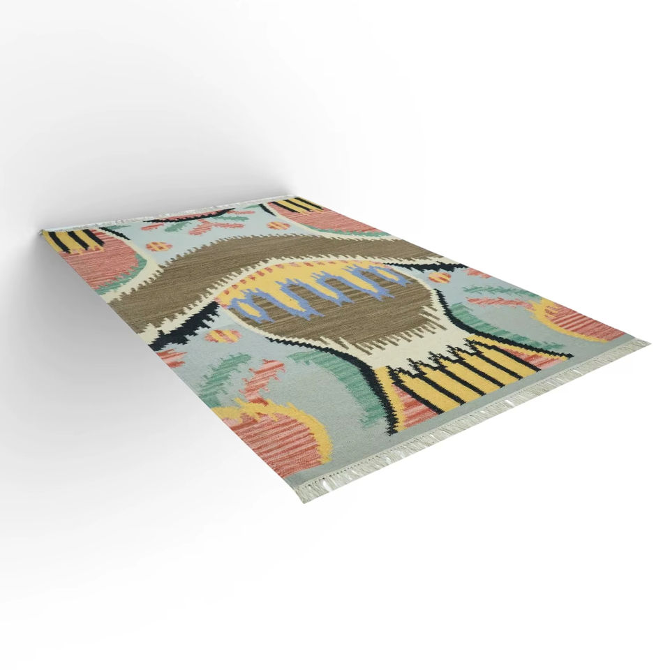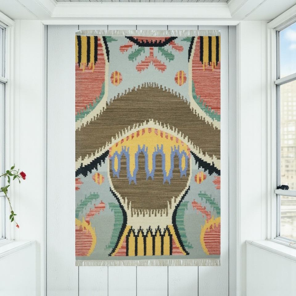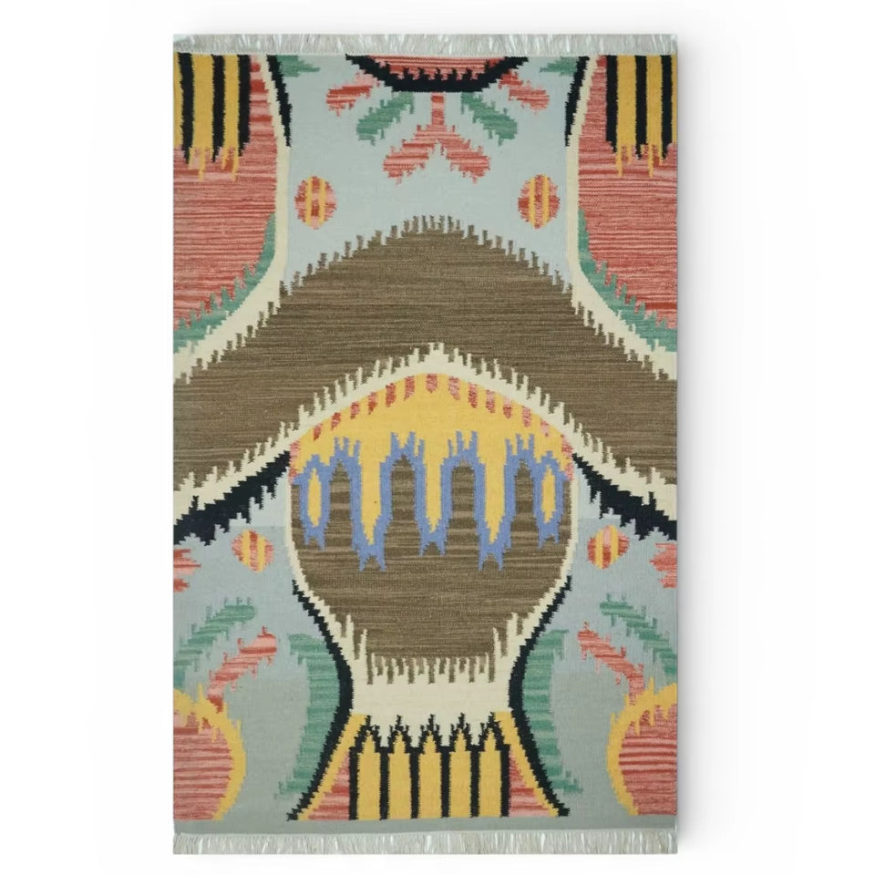 Alfombra Persa Abstracta de Lana Hecha a Mano, Tejido Plano, Ecológica | Alfombra Antigua de Estilo Vintage