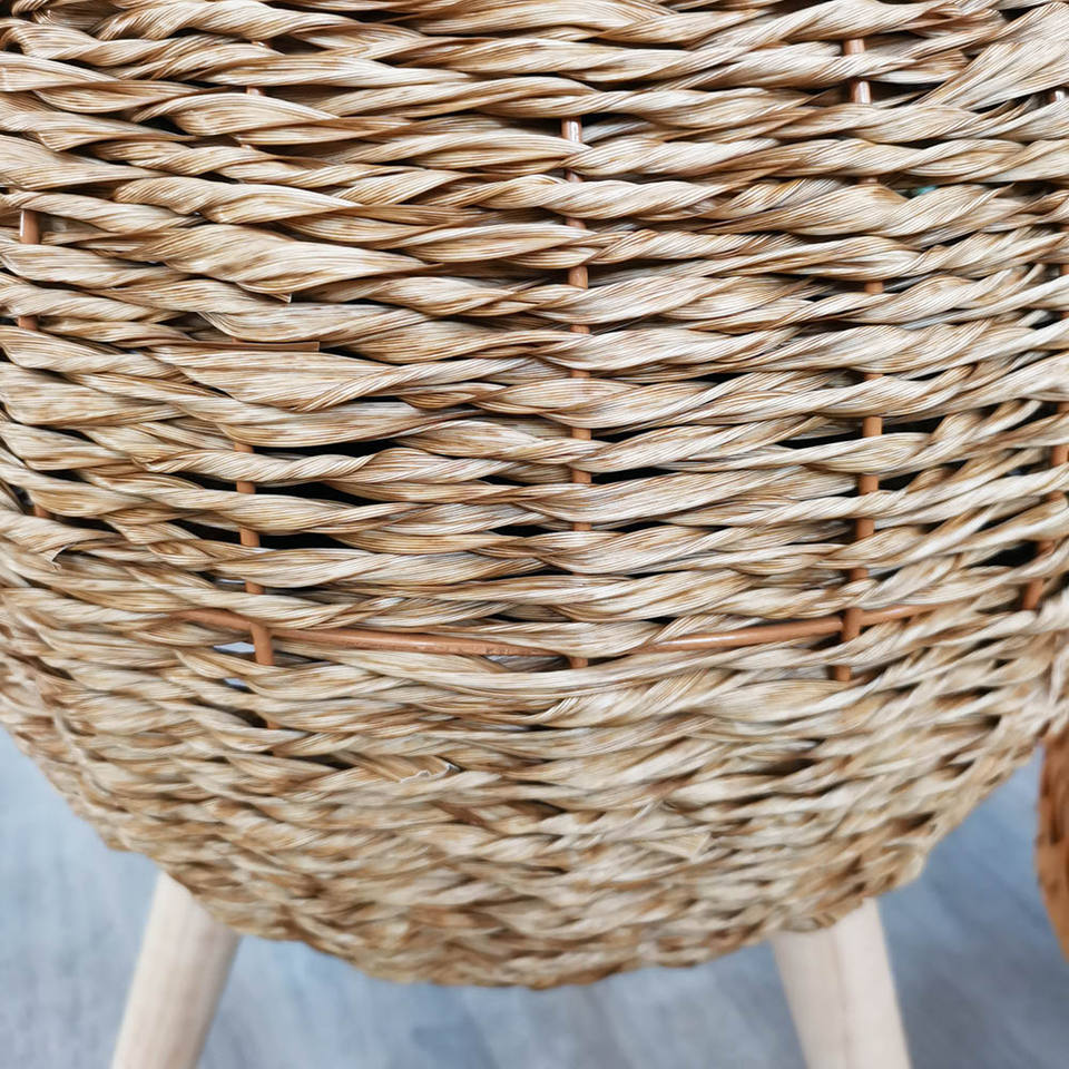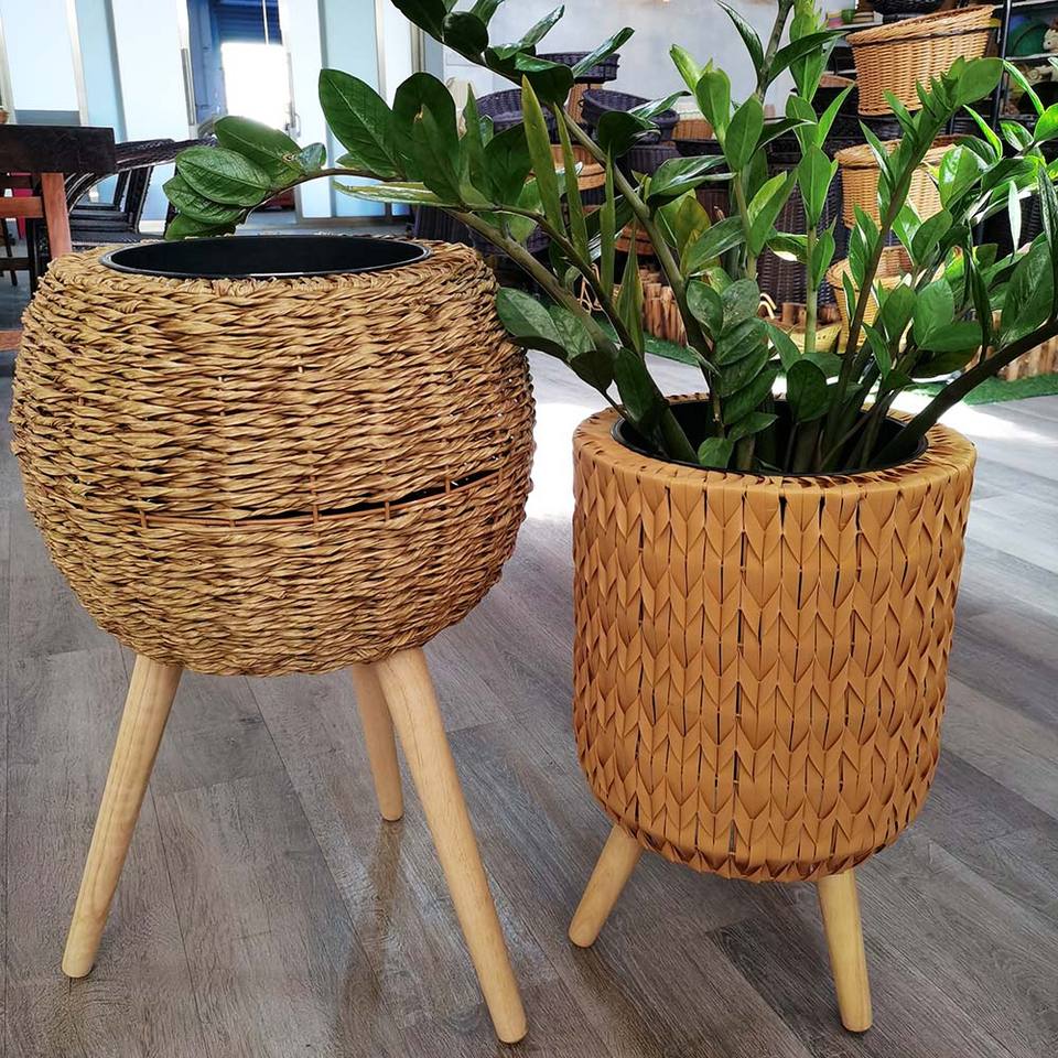 Maceta tejida hecha a mano para plantas, maceta de ratán PE con soporte, patas de madera, cesta para macetas al aire libre
