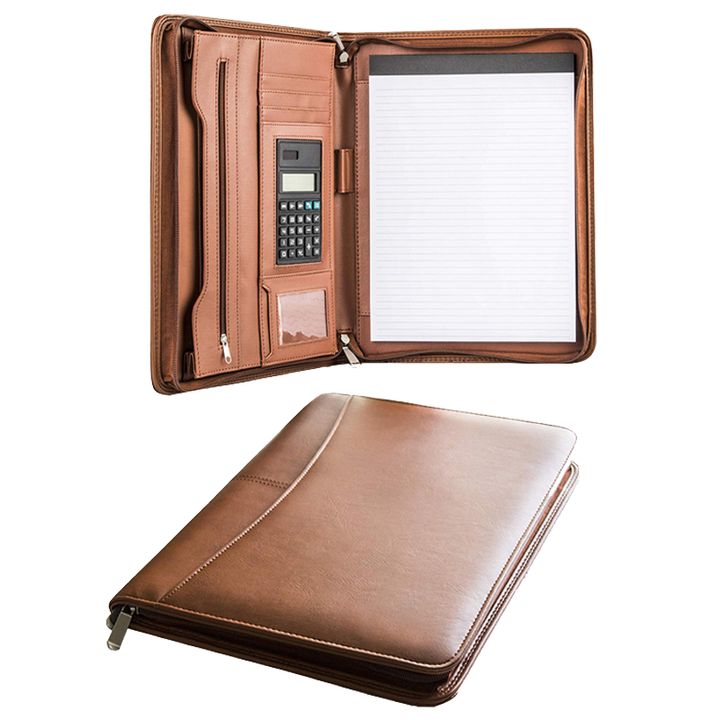 Portafolio con Cremallera Hecho a Mano, Carpeta de Archivos A4, Maletín de Cuero Vegano Marrón con Calculadora, Impermeable, Ecológico, Unisex