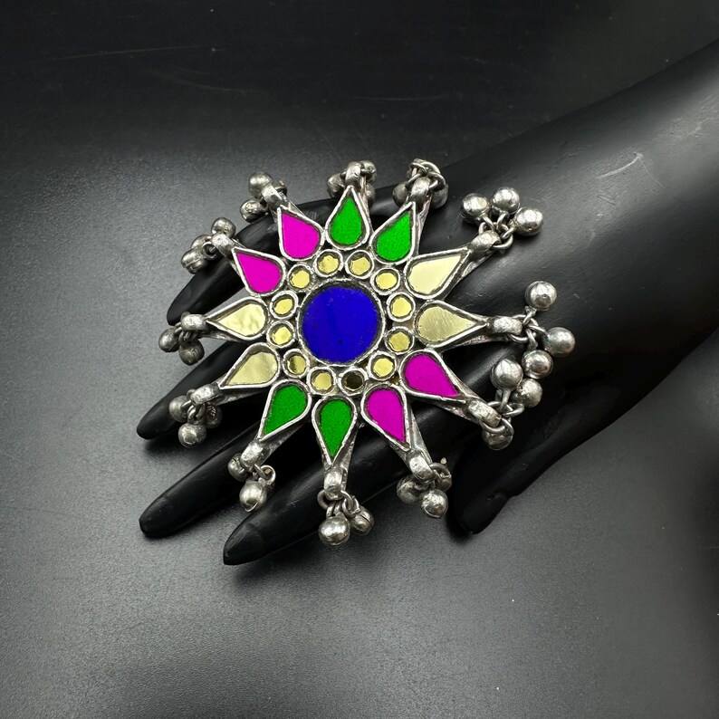 Anillo de declaración de Afghani Sunburst hecho a mano anillo de dedo ajustable tribal de vidrio multicolor estilo kuchi espejo Boho joyería navratri