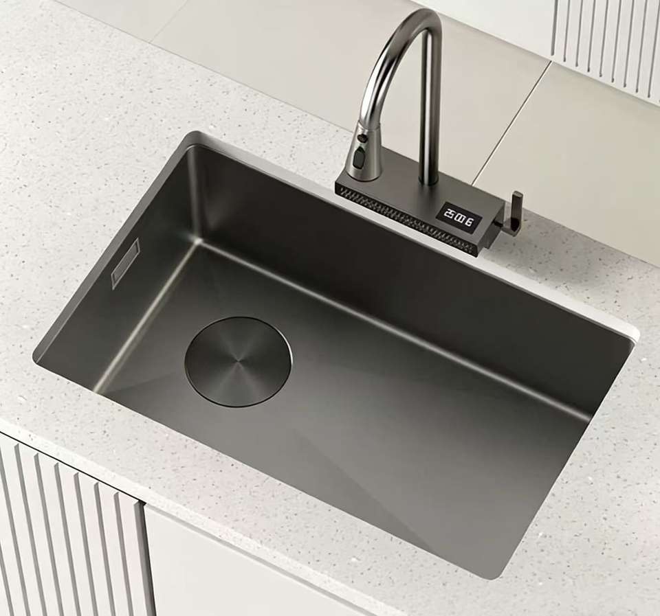 Grifo de cocina rectangular de doble capa de acero inoxidable hecho a mano con salida de agua en cascada y un solo orificio.