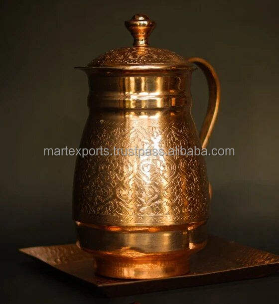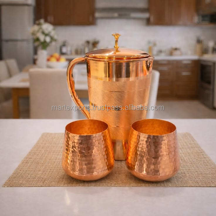 Jarra de cobre macizo hecha a mano con tapa, diseñada para almacenar agua ayurvédica e hidratación diaria en casa u oficina.