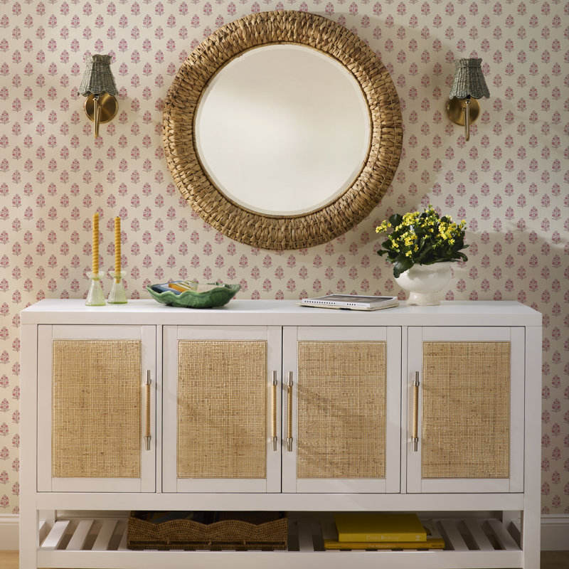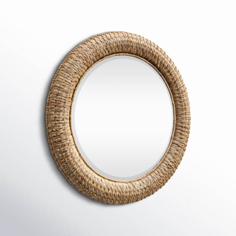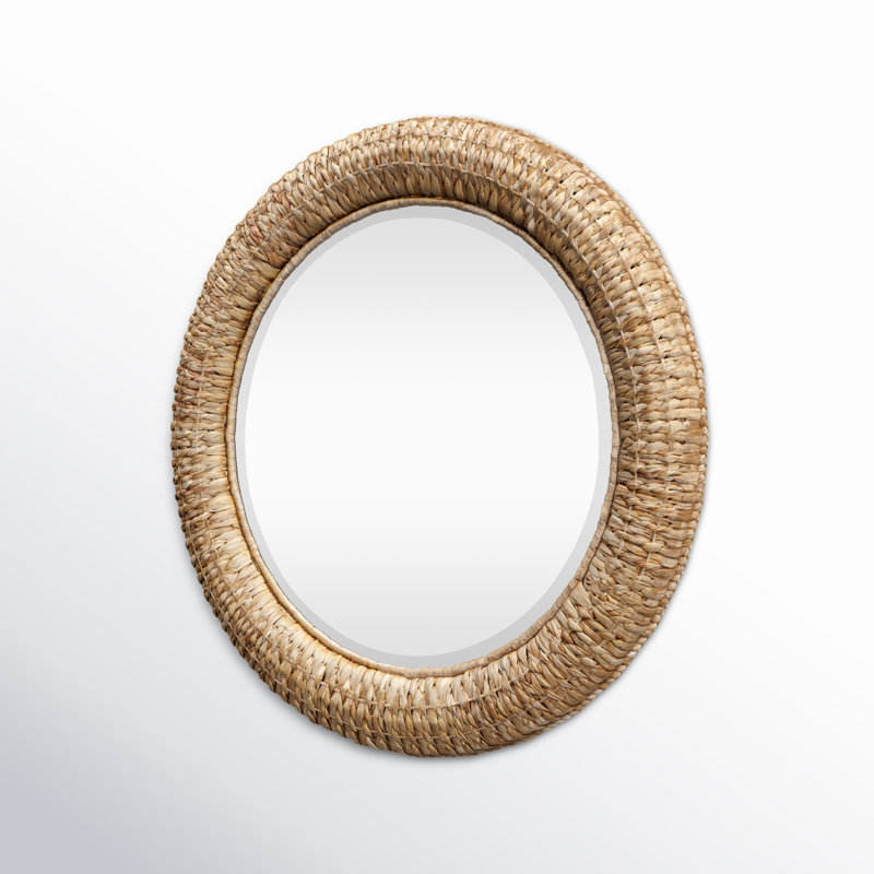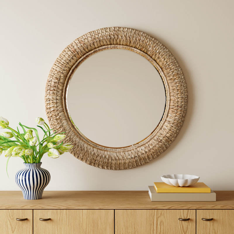 Espejo redondo de pared de algas marinas bohemias tejidas a mano con marco natural