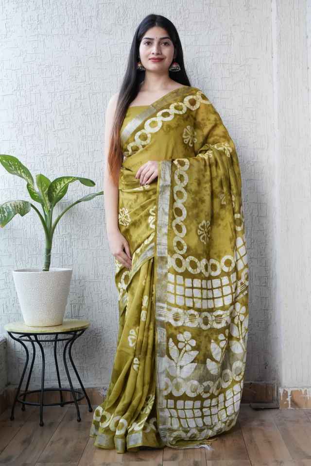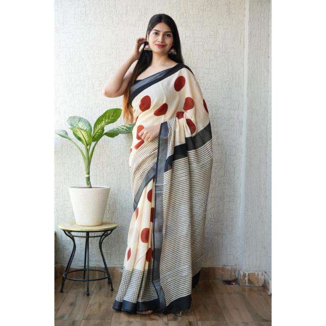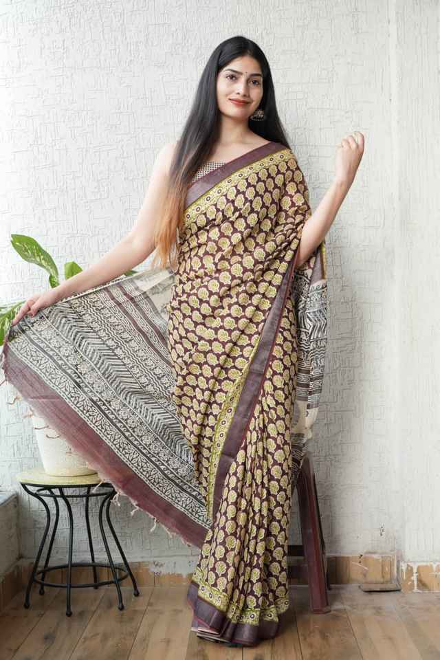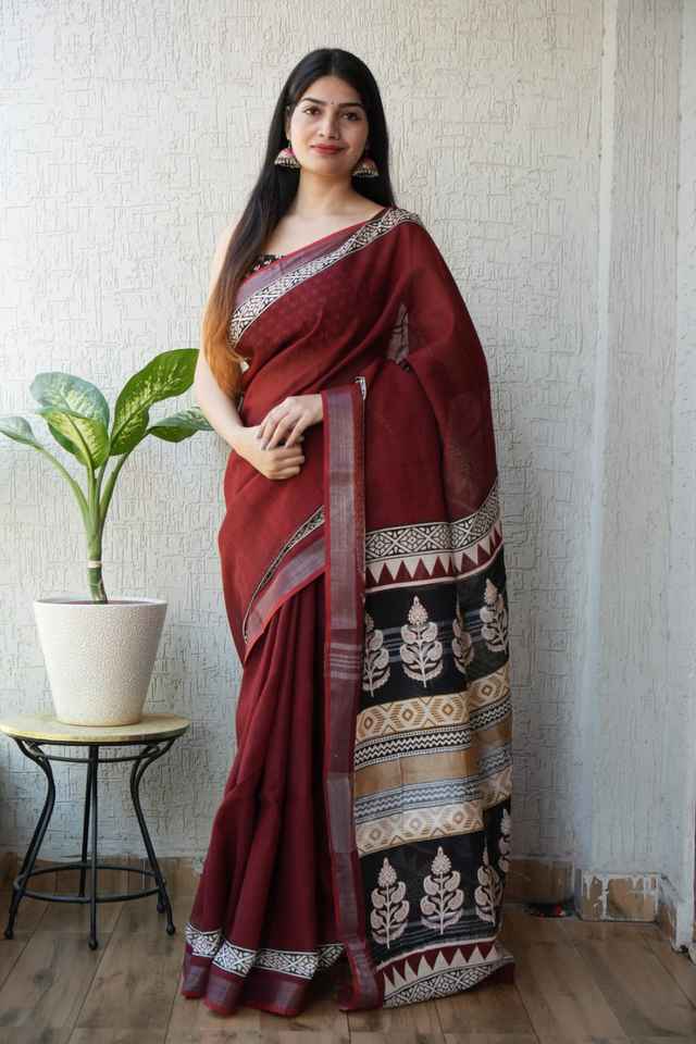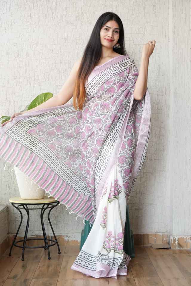 Sarees de lino puro con estampado único de algodón tejido a mano y blusa de lino que brinda un aspecto atractivo en todas las ocasiones y el día a día.