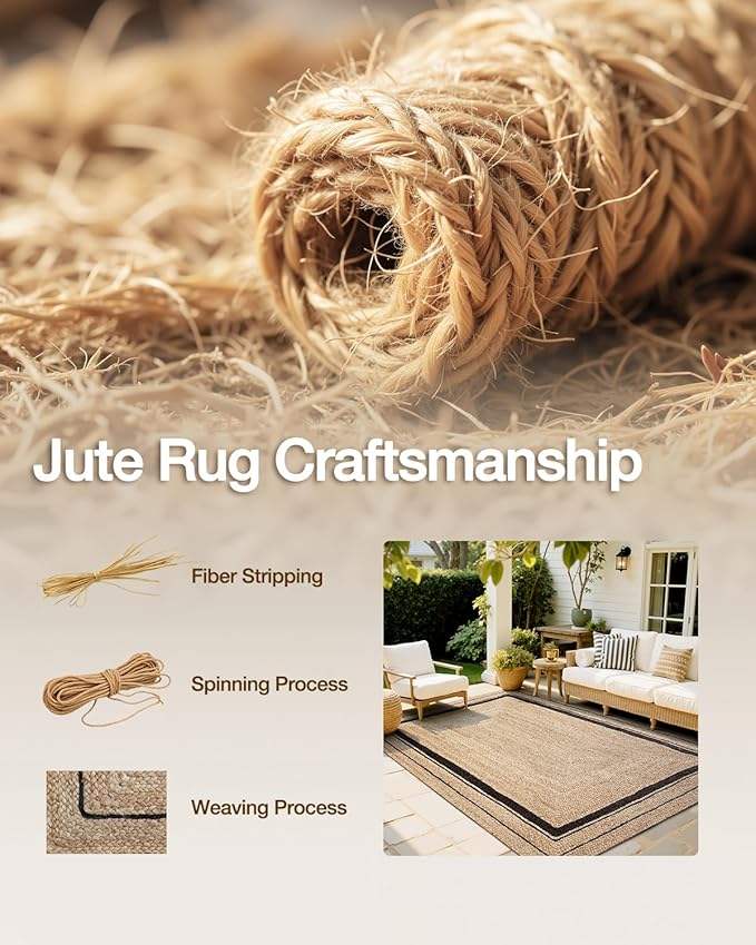 Alfombra de Yute Tejida a Mano, Alfombra de Fibra Natural con Borde Negro, Alfombra Ecológica para Sala de Estar, Dormitorio, Decoración del Hogar