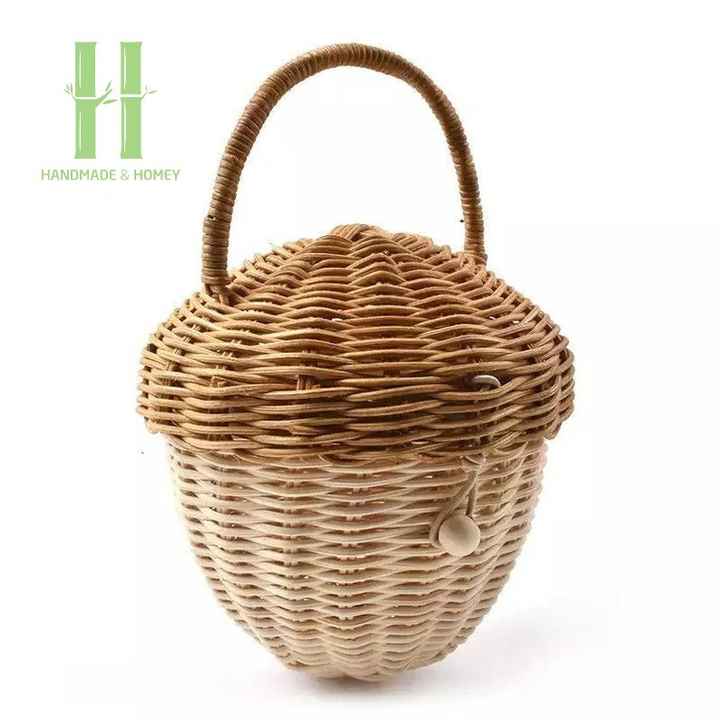 Cesta Rectangular Bohemia Tejida a Mano de Ratán Natural Ecológico, con Forma de Bellota Colorida, Personalizable para Niños, Diseños para Bodas