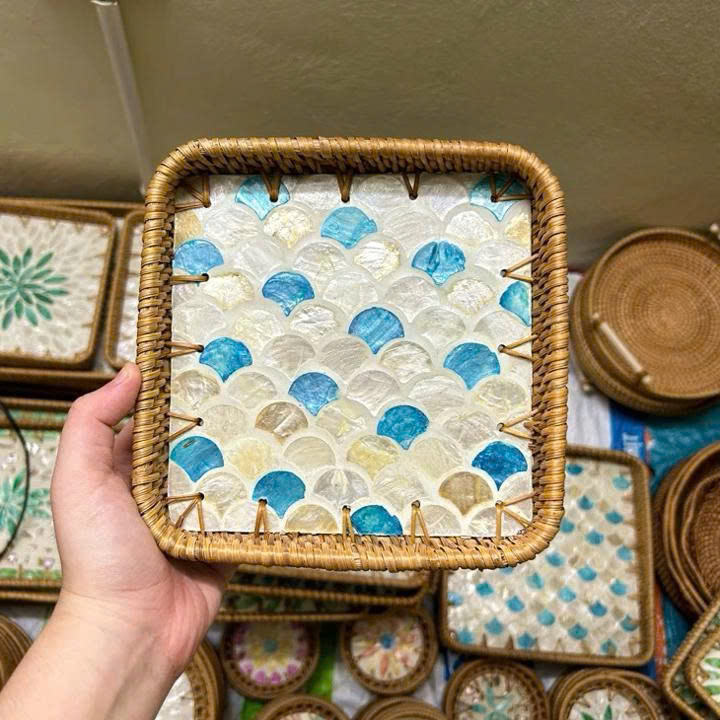 Bandeja de Ratán Natural Tejida a Mano con Elementos de Concha de Perla y Madreperla para Decoración de Interiores y Mesas