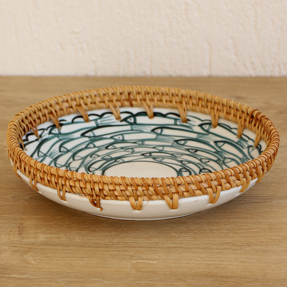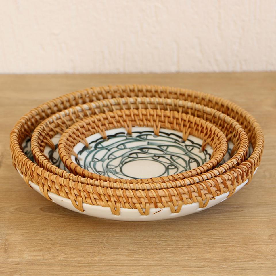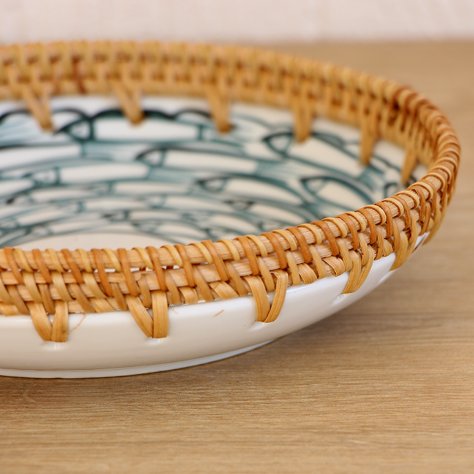Nueva bandeja de ratán tejida a mano con centro de mesa de cerámica Bandeja redonda para servir para mesa Cesta tejida a mano Venta al por mayor hecha en Vietnam