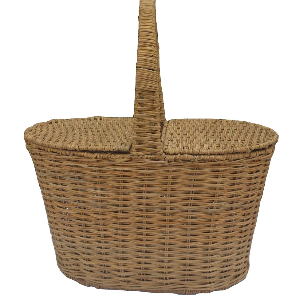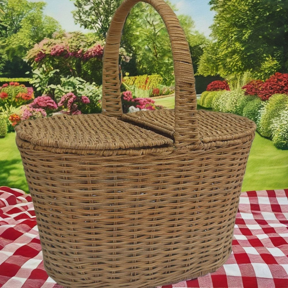 Cesta ovalada de ratán tejida a mano con soporte de hierro – Almacenamiento multiusos para el hogar y pícnic