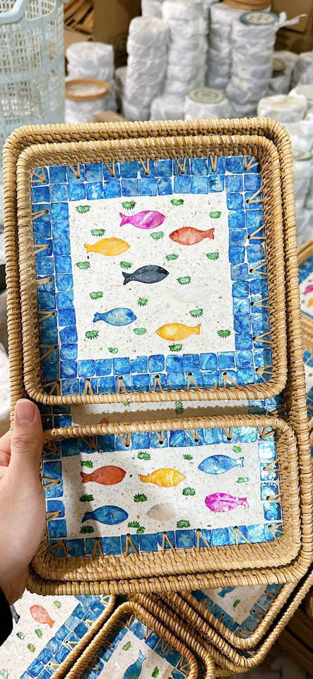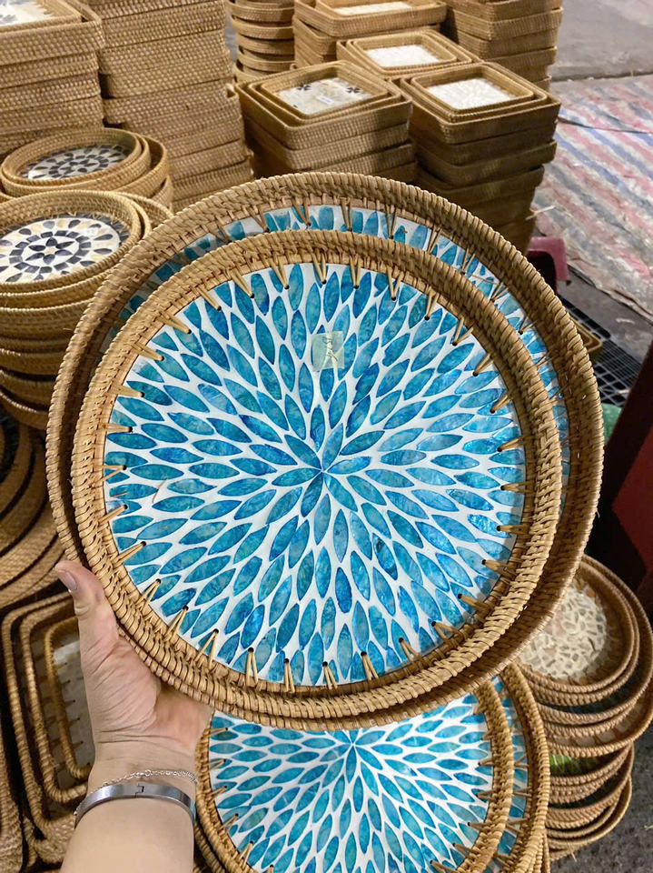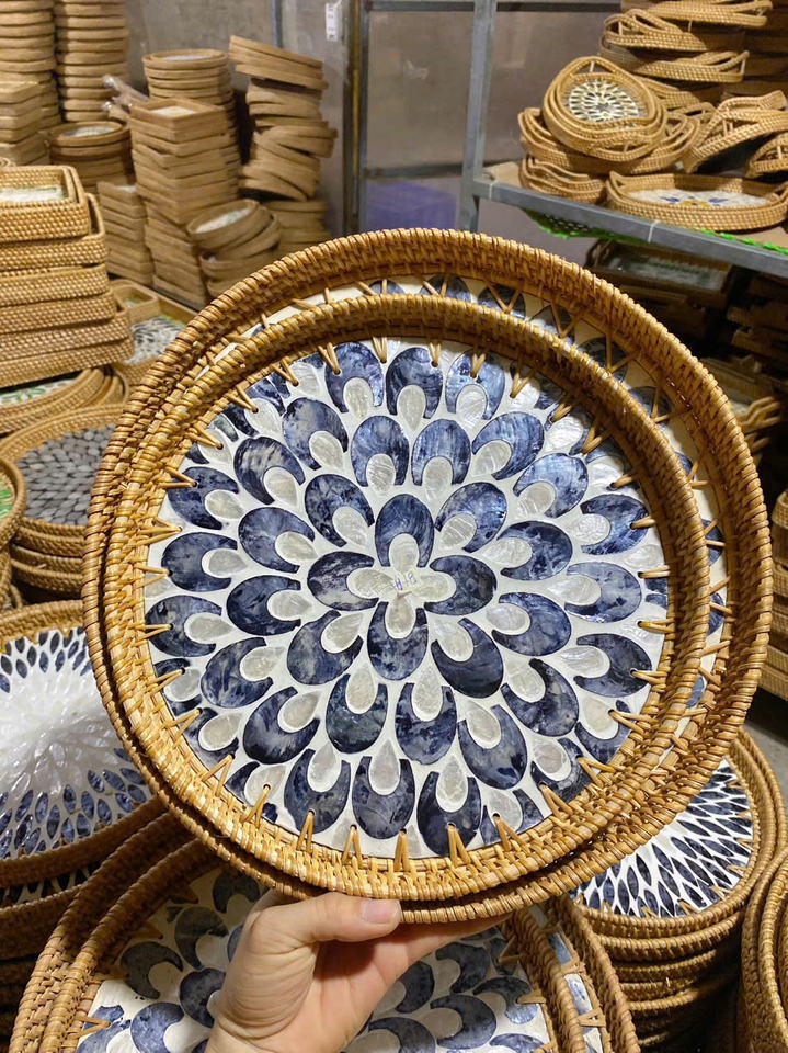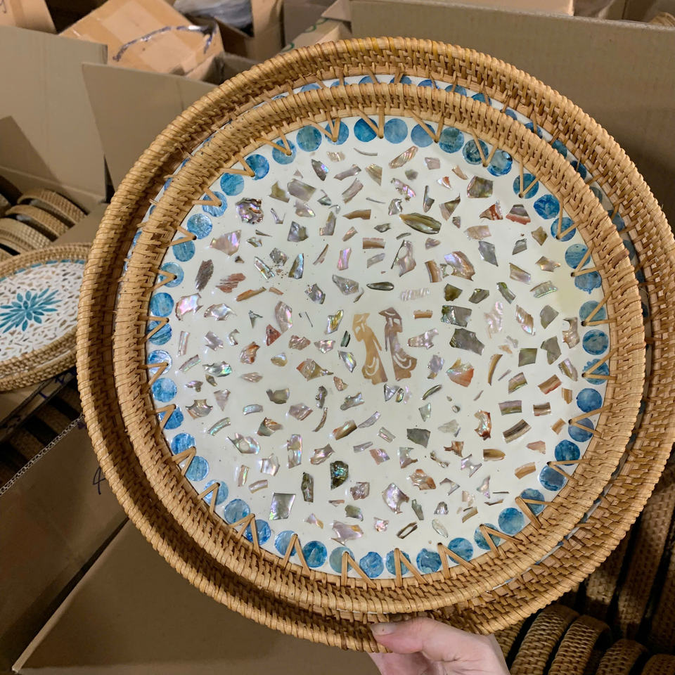 Bandeja de servicio decorativa de lujo con incrustaciones de ratán tejida a mano