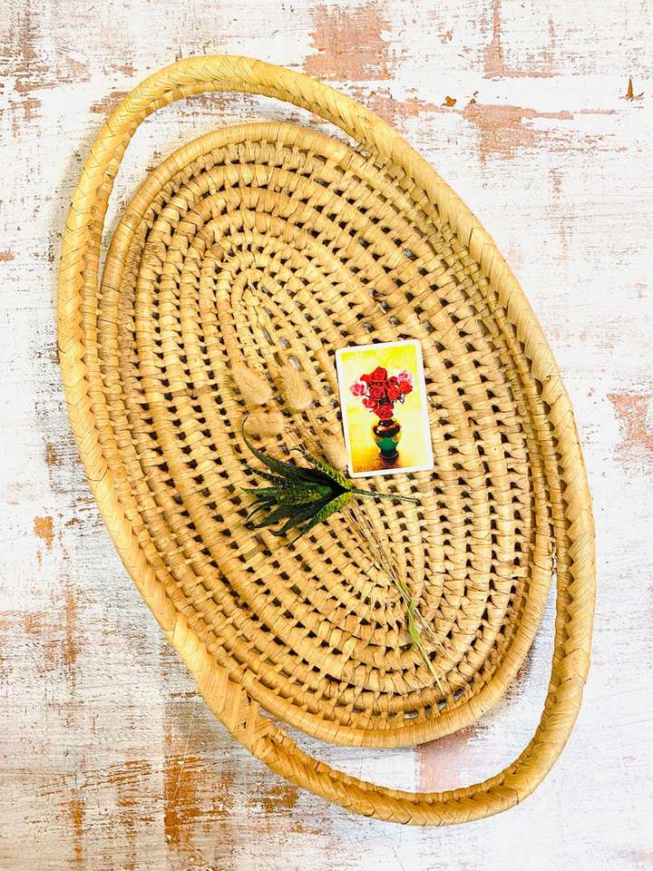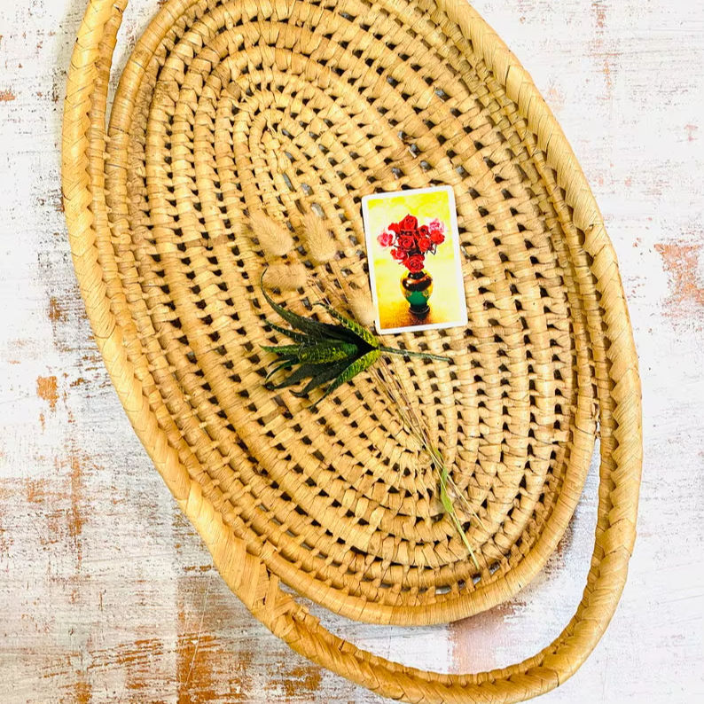 Bandeja de Servir de Ratán Tejida a Mano con Asas, Bandeja Redonda de Ratán para Decoración de Mesa, Bandeja Rectangular de Caña para Servir