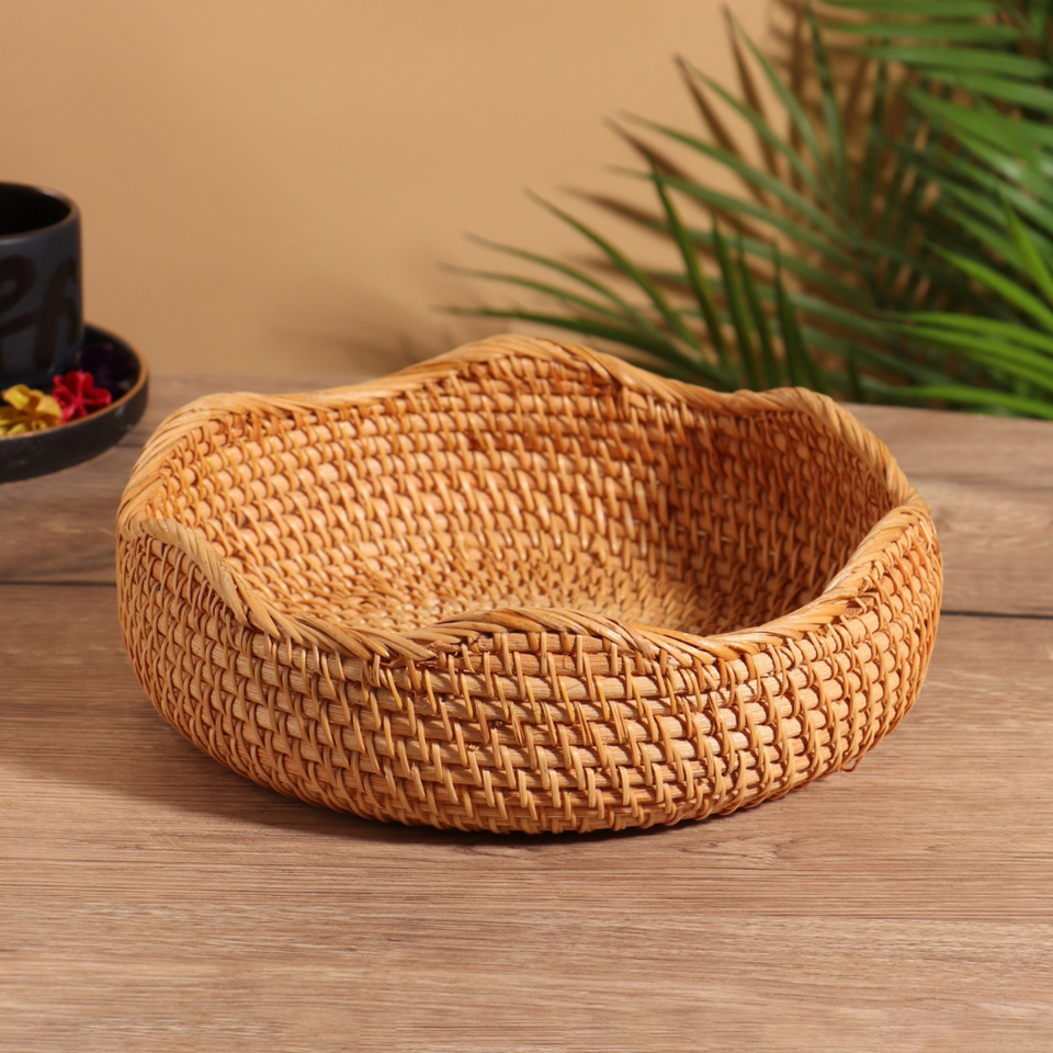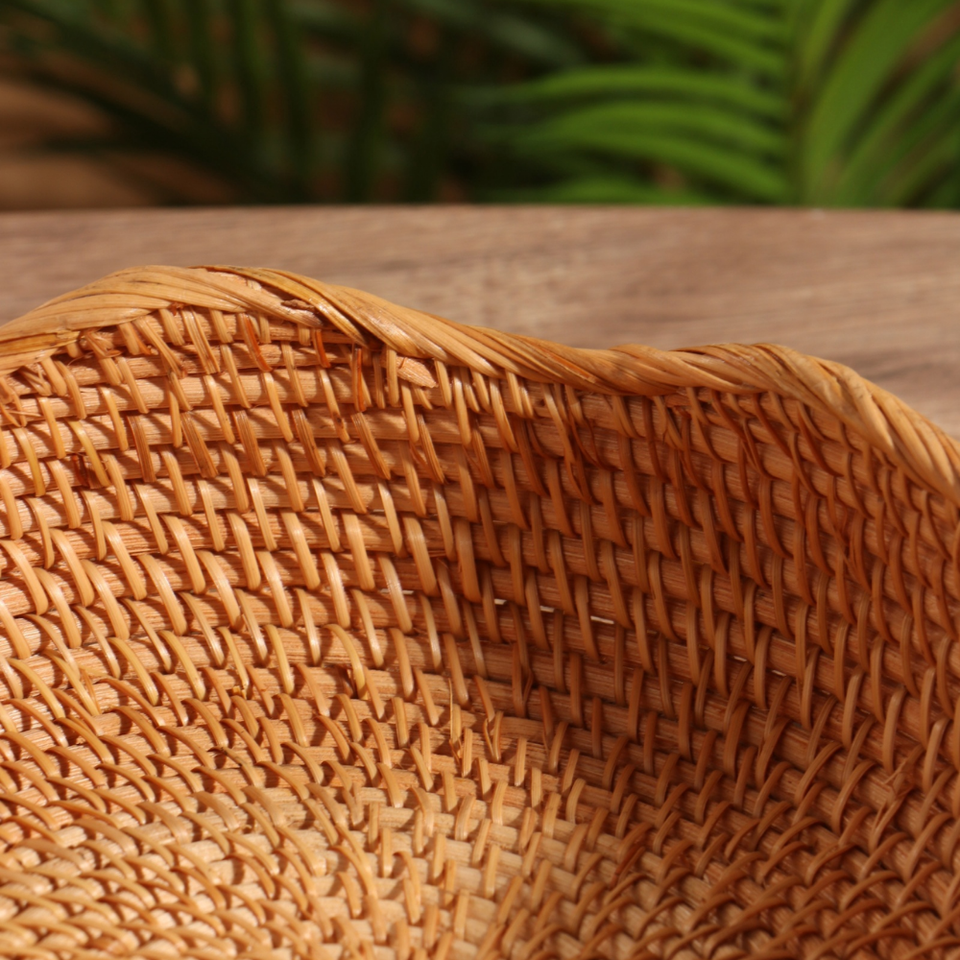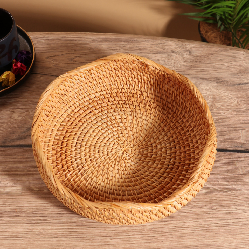 Bandeja Redonda de Ratán Tejida a Mano con Borde Festoneado / Elegante Plato Decorativo de Mimbre para Servir Frutas, Pan y como Centro de Mesa
