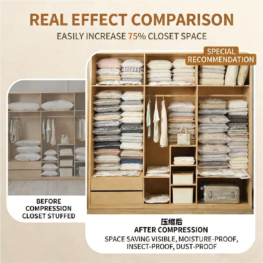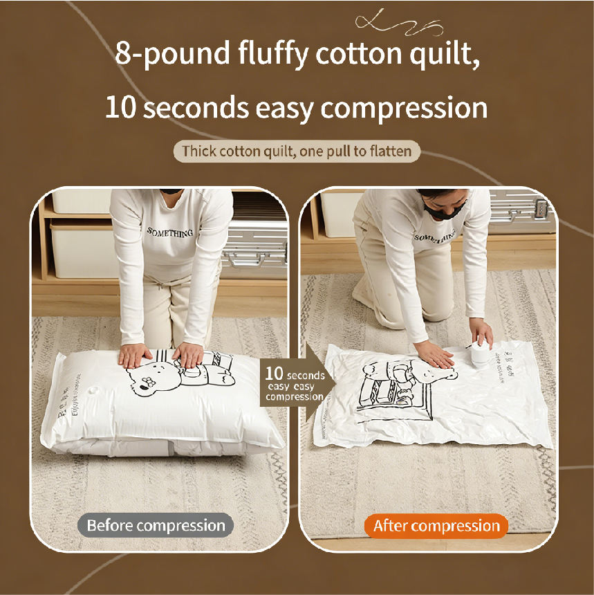 Diseño de almacenamiento al vacío: El diseño de almacenamiento al vacío permite una compresión eficiente, ahorrando espacio y protegiendo la ropa del polvo y la humedad.
