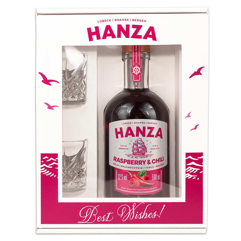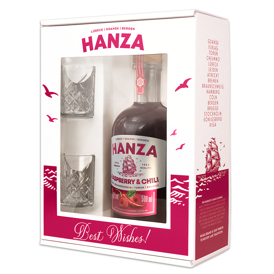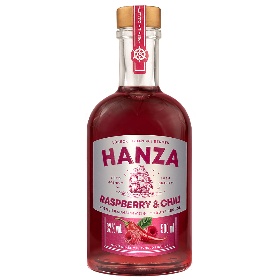 Liqueur Hanza Raspberry & Chili 32% 500ml, una bebida única con sabor a frambuesa y chile, productor europeo, productor polaco,