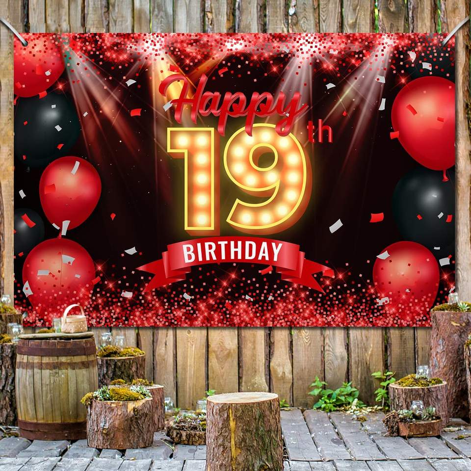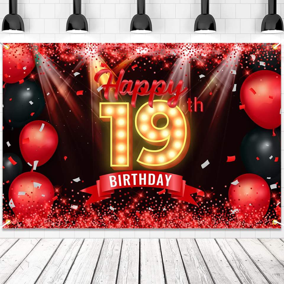 Fondo de Banner de feliz 19 cumpleaños para niñas y mujeres, decoración de fondo de cumpleaños de 19 años, rojo y negro