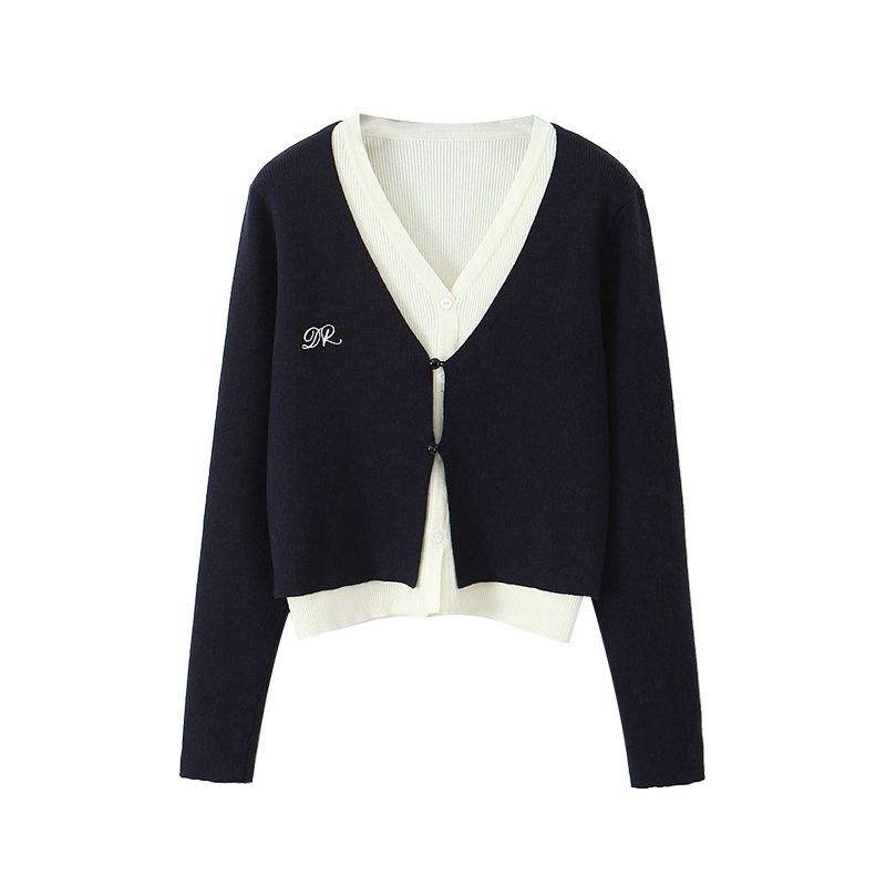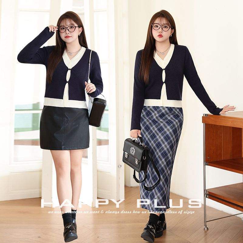 Suéter de Punto con Cuello en V y Bloques de Color Happy Plus, Manga Larga, Talla Grande para Mujer, Color Azul Gema, Estilo Universitario N8825