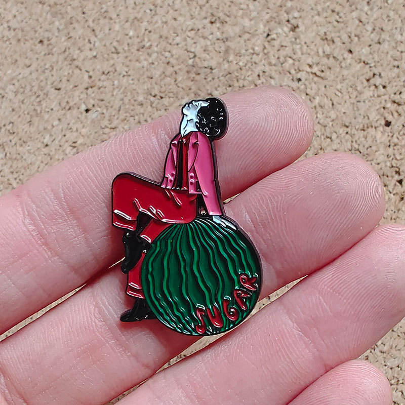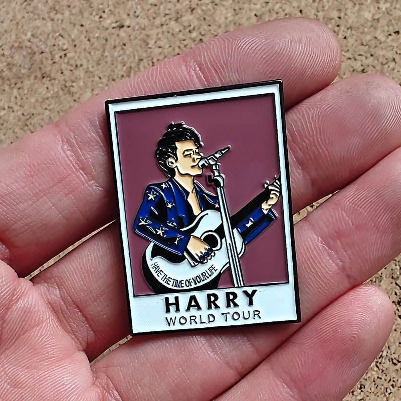 Broche de esmalte popular de alta calidad con diseño de dibujos animados del cantante Harry Styles, insignia con letras de música y mensaje.