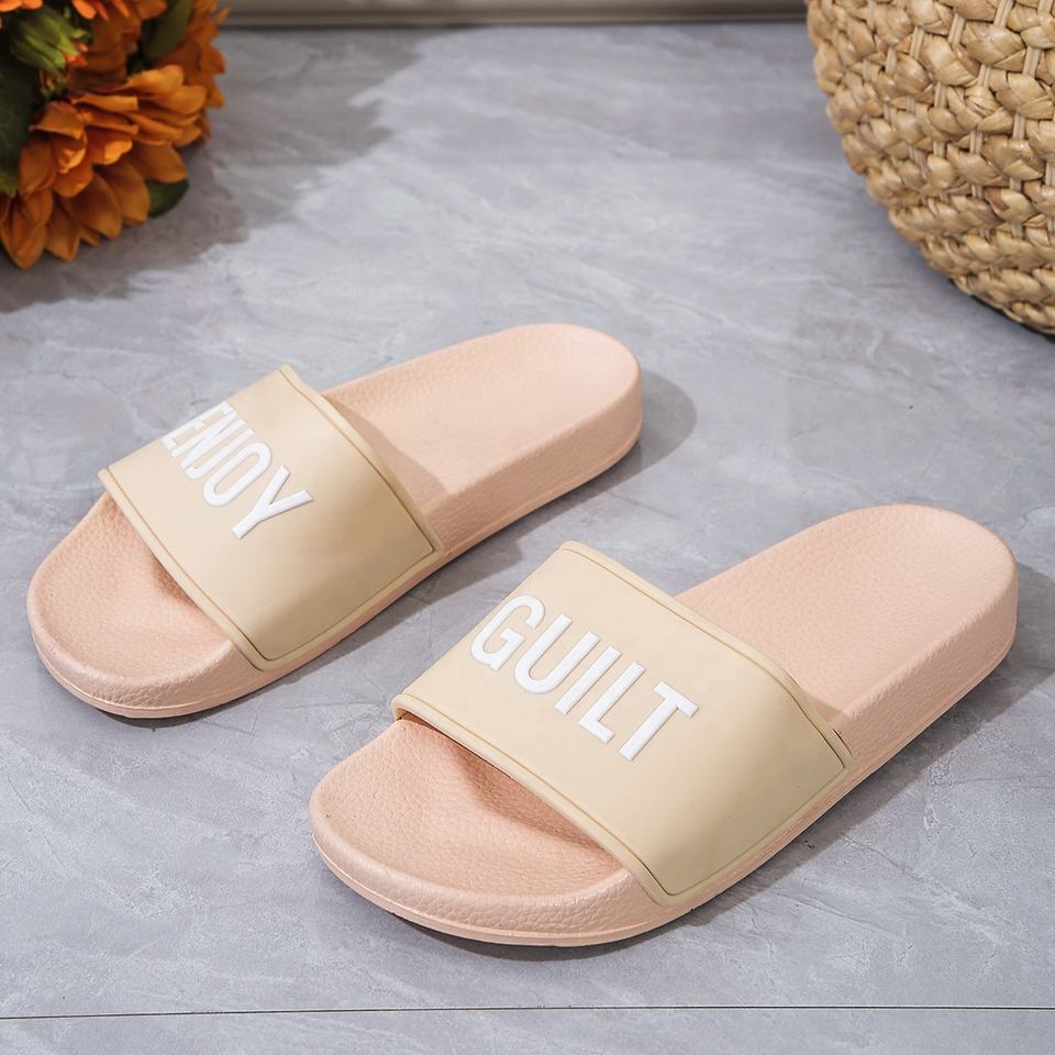 Happyslide diseñador personalizado piel rosa Slider diapositivas nueva llegada bajo MOQ goma mujer Hotel casa zapatilla sandalias hombres señoras