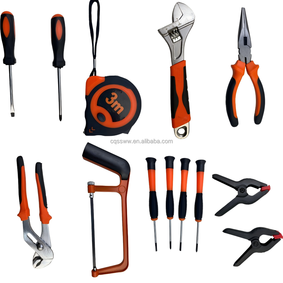 Alicate de punta larga: 6", Alicate Combinado: 6", Alicate pelacables, Llave multifunción, Tijeras, Martillo de garra, Cinta Métrica: 3 m, Cuchillo Multiusos, sierra pequeña, sonda eléctrica, Cinta aislante, Nivel de burbuja: 6, Mango de broca, Un destornillador 5,8*100, Destornillador de cruz 5.8*100, Llave Allen:, 1/4" Enchufe, 1/4" ScoketBit ADA, Broca helicoidal: 5-6-8, Broca para Albañilería: 5-6-8, Taladro para madera: 5-6-8, Eje flexible, Mandril de sierra perforadora, Caja de fijación 60PC, Caja de moldeo por soplado, Taladro inalámbrico