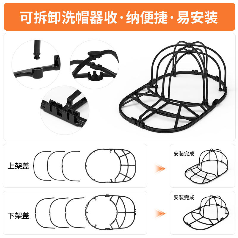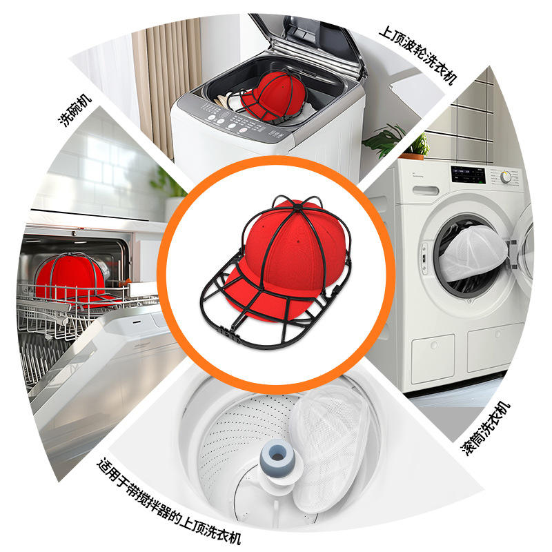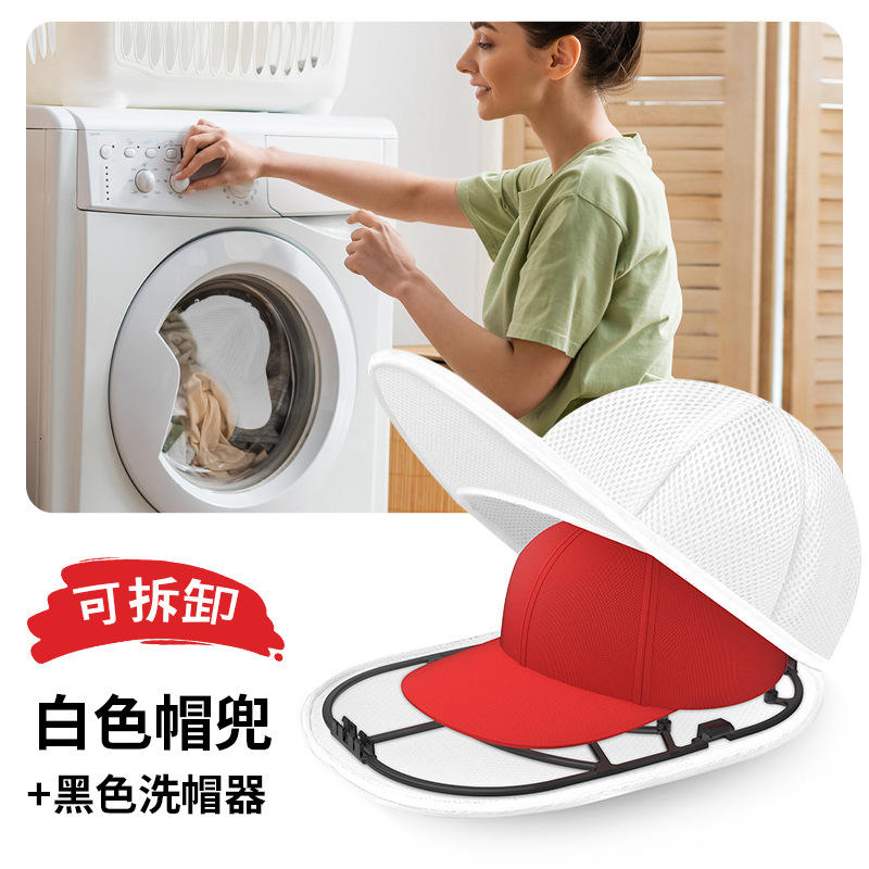 Soporte para lavar gorras con cubierta blanca extraíble y base negra para uso en lavadora