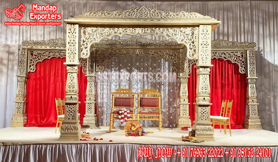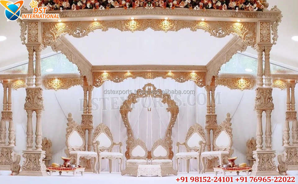 Mandap de Bollywood de estilo Haveli para Bodas de Rajwada, Mandaps DE BODA tallados de fibra dorada, Mandap DE BODA asequible al mejor precio de EE. UU.