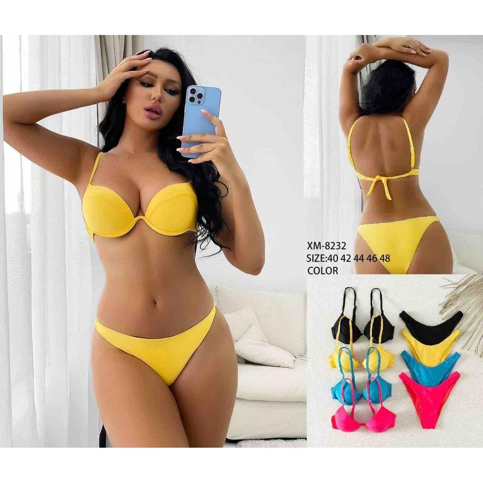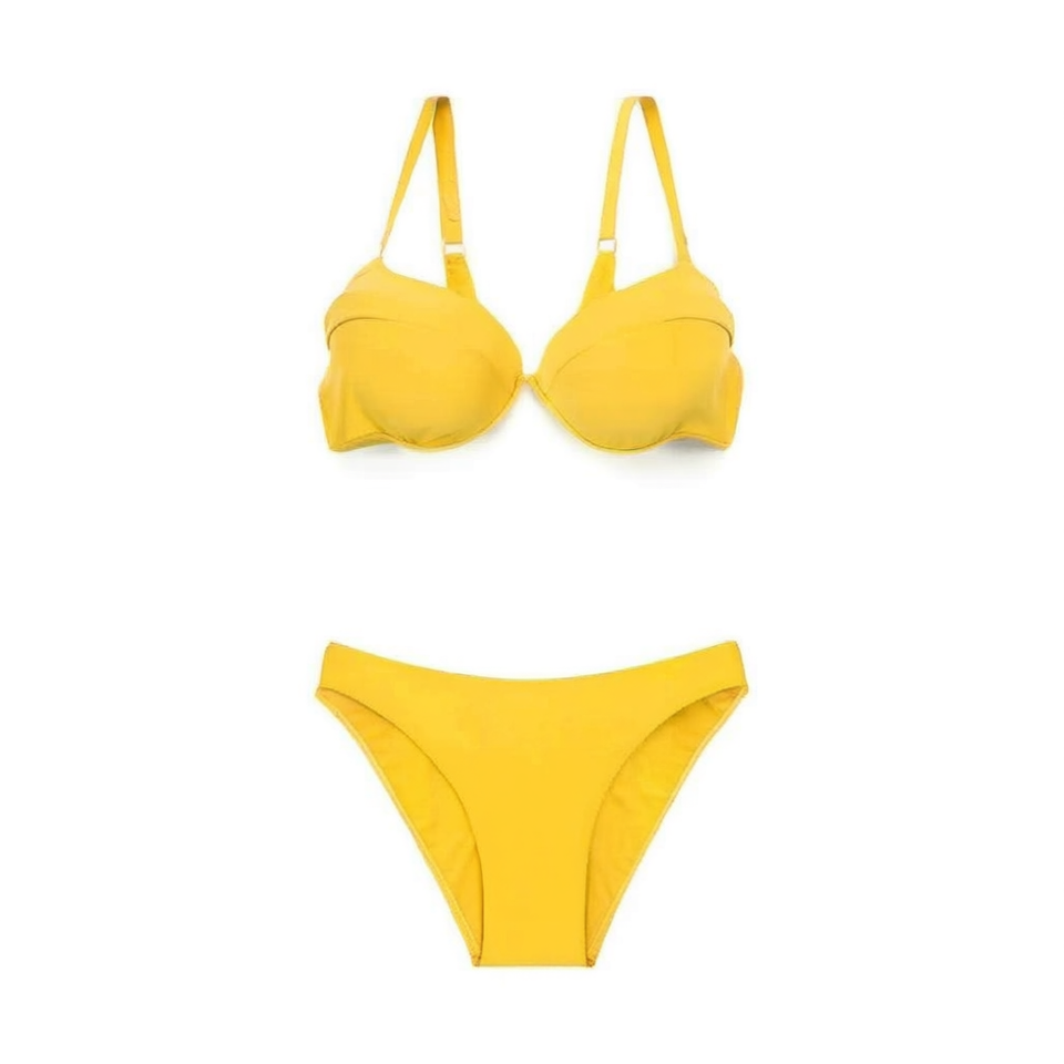 Conjunto de Bikini HDJ Tallas Grandes Amarillo con Push-Up y Control de Abdomen, Traje de Baño de 2 Piezas para Mujer, Braguita Tanga de Color Sólido, Tallas 40 42 44 46
