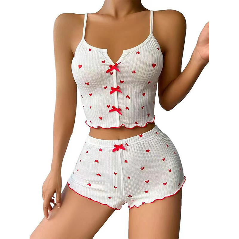 Conjunto de 2 Piezas de Pijama para Mujer con Estampado de Corazones y Contraste de Colores, Camisola con Abertura Frontal y Pantalones Cortos, Ropa de Dormir a la Moda