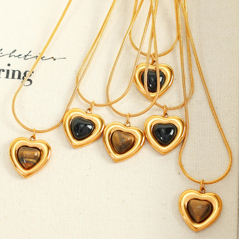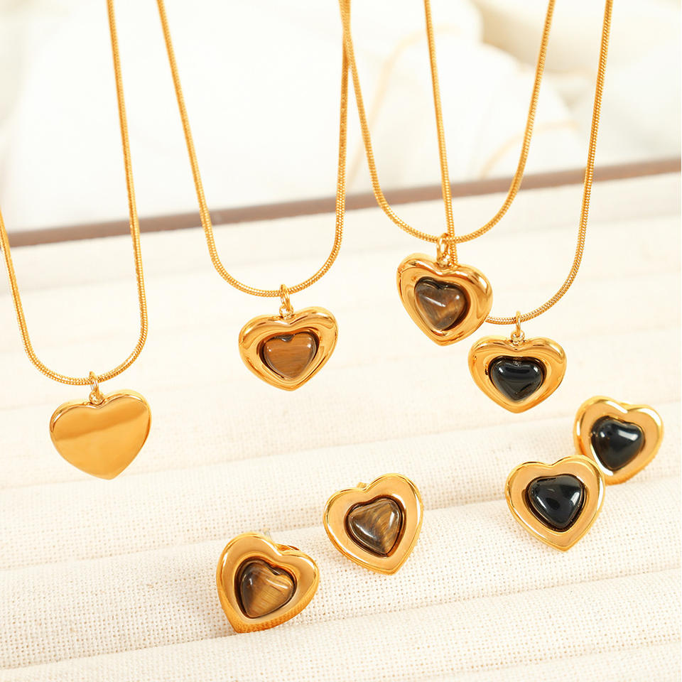Conjunto de joyería de piedra natural con forma de corazón para mujer, con engaste de bisel, para uso diario, collar de clavícula, pendientes, tono dorado