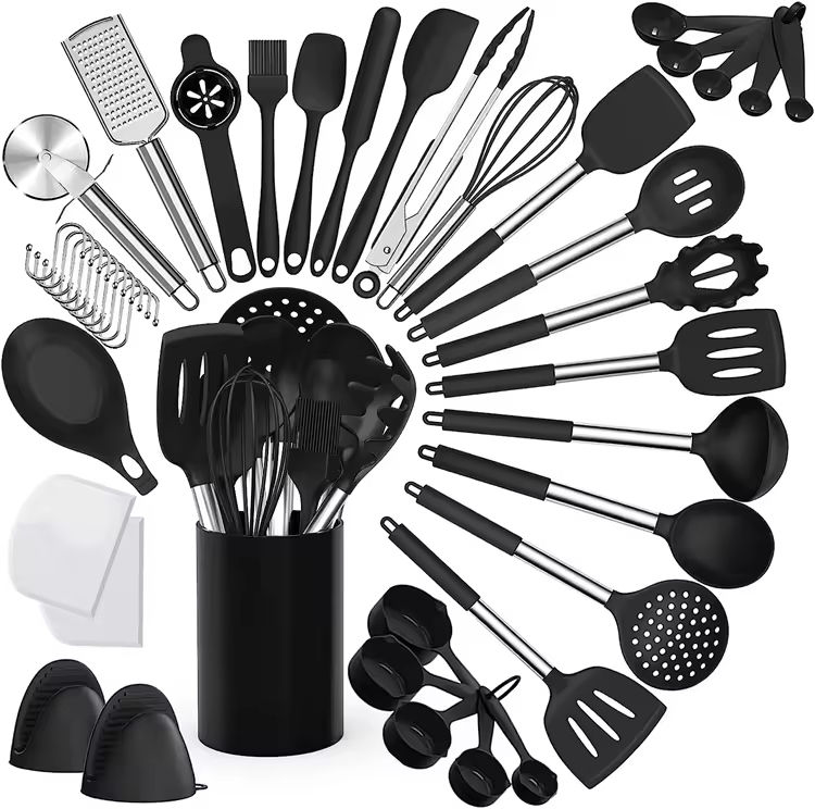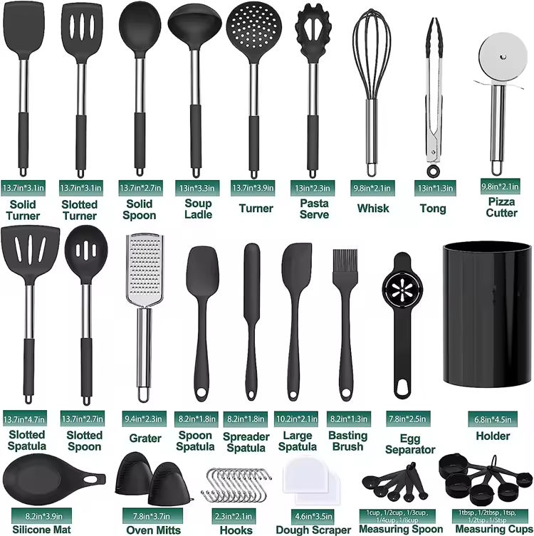 Utensilios de Cocina Resistentes al Calor, Juego de 43 Piezas de Utensilios de Cocina de Silicona con Mango de Acero Inoxidable y Soporte