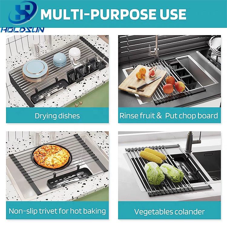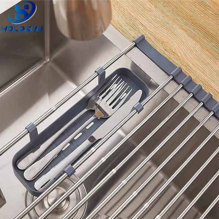 Escurridor de Platos Enrollable de Acero Inoxidable Resistente al Calor, Plegable, para Fregadero de Cocina, con Cesta de Almacenamiento para Cucharas y Tenedores