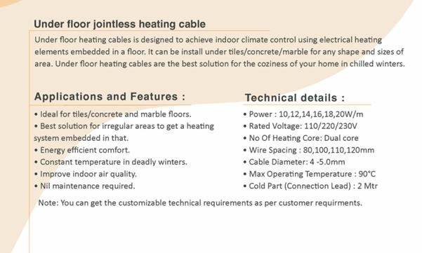 Cable de calefacción sin juntas para debajo del suelo, ideal para pisos de baldosas, concreto y mármol. Eficiente en termos de energía para el invierno. Mejora la calidad del aire interior.