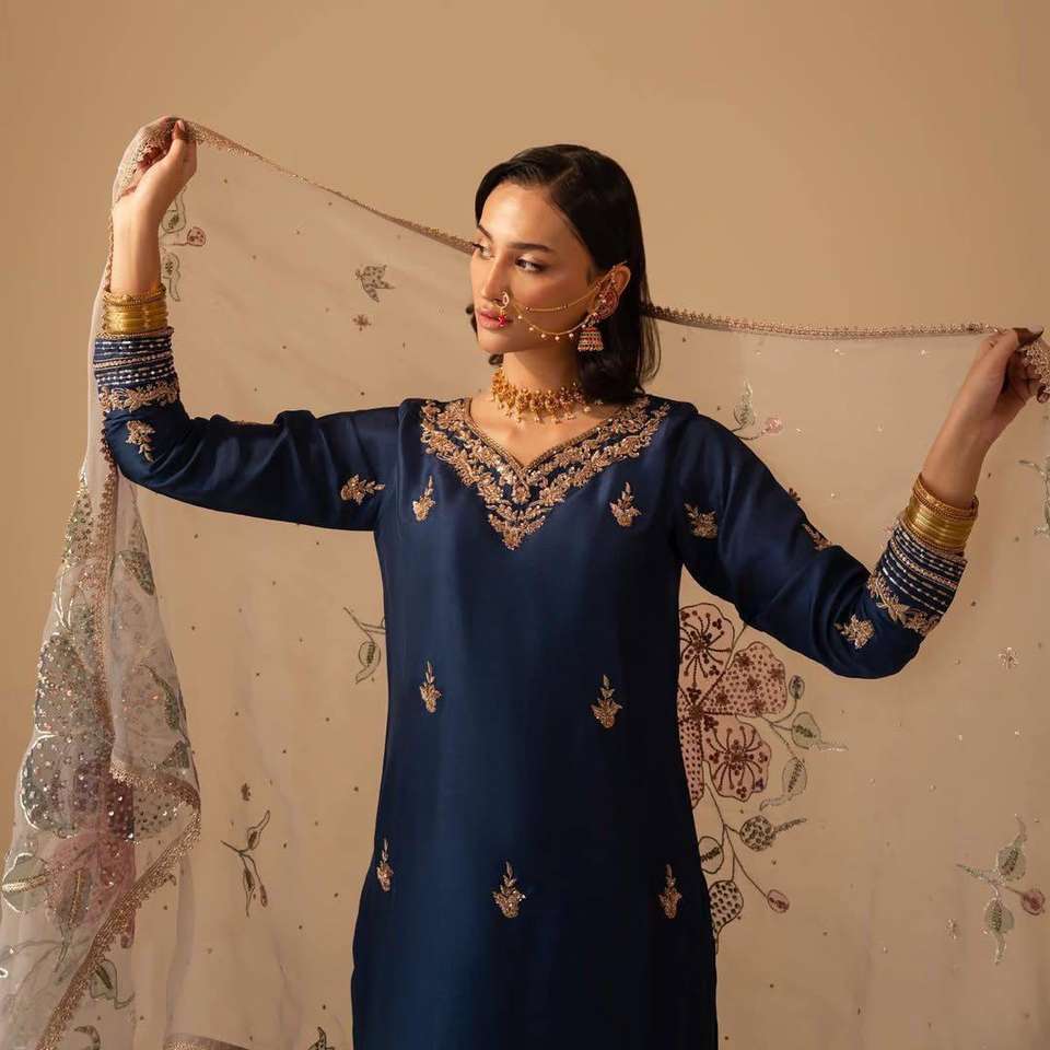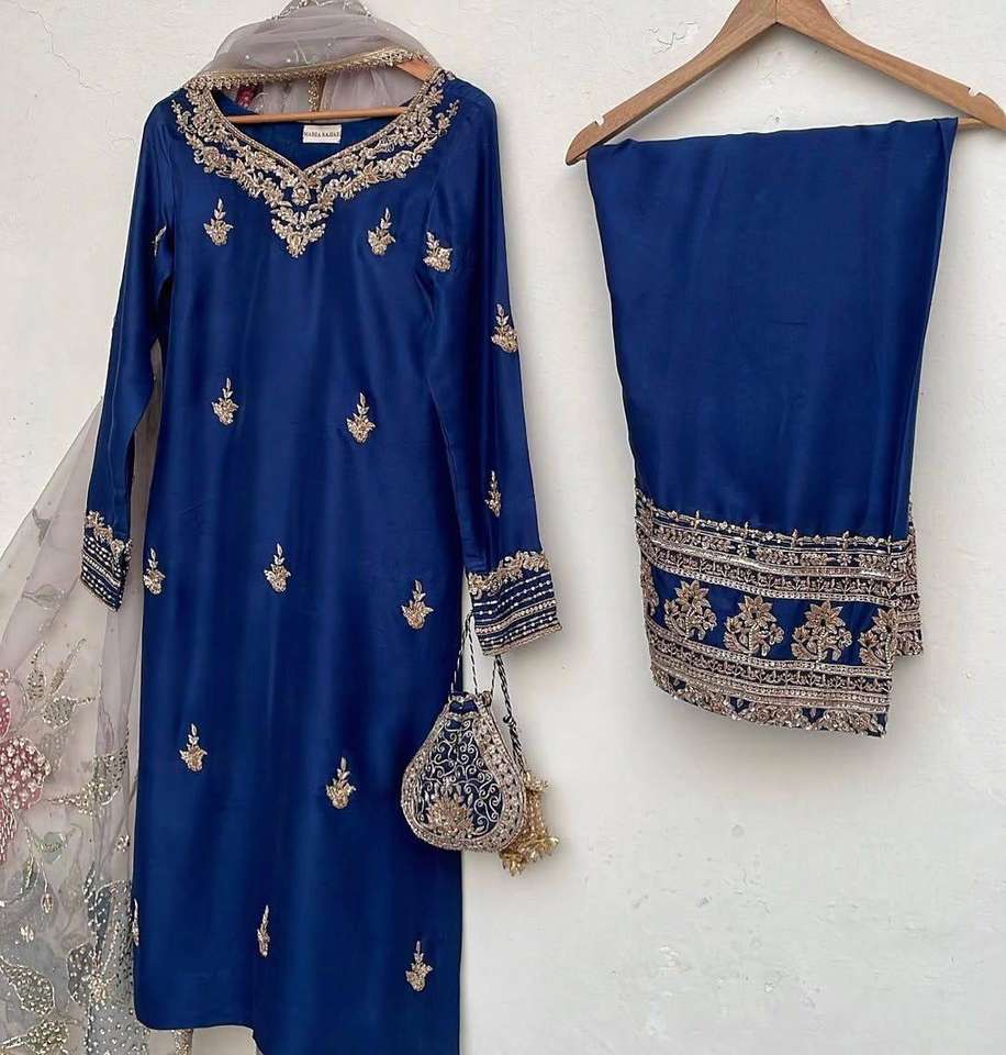 Heavy Collection Diseño elegante Nueva seda Chinon pura con secuencia bordada pesada Top de trabajo y pantalón con conjunto de traje Dupatta