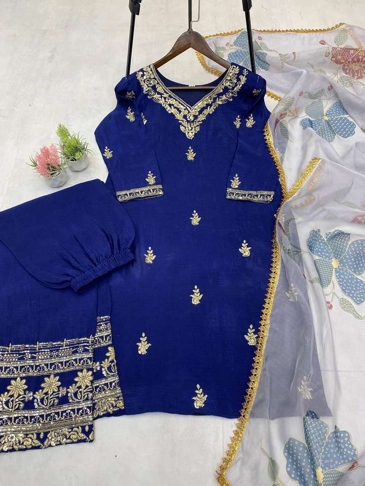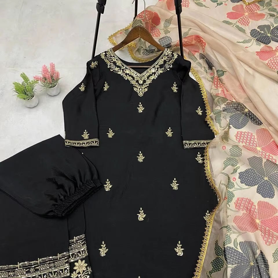 Chinon seda bordado secuencia trabajo Top y pantalón Dupatta