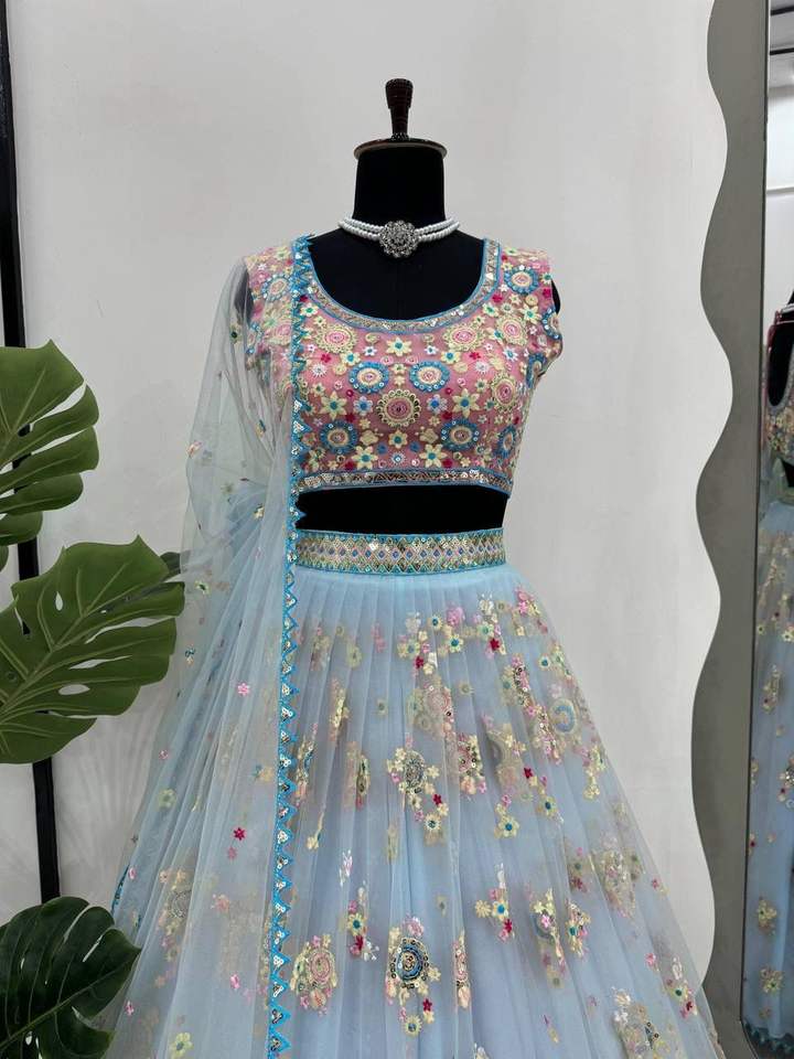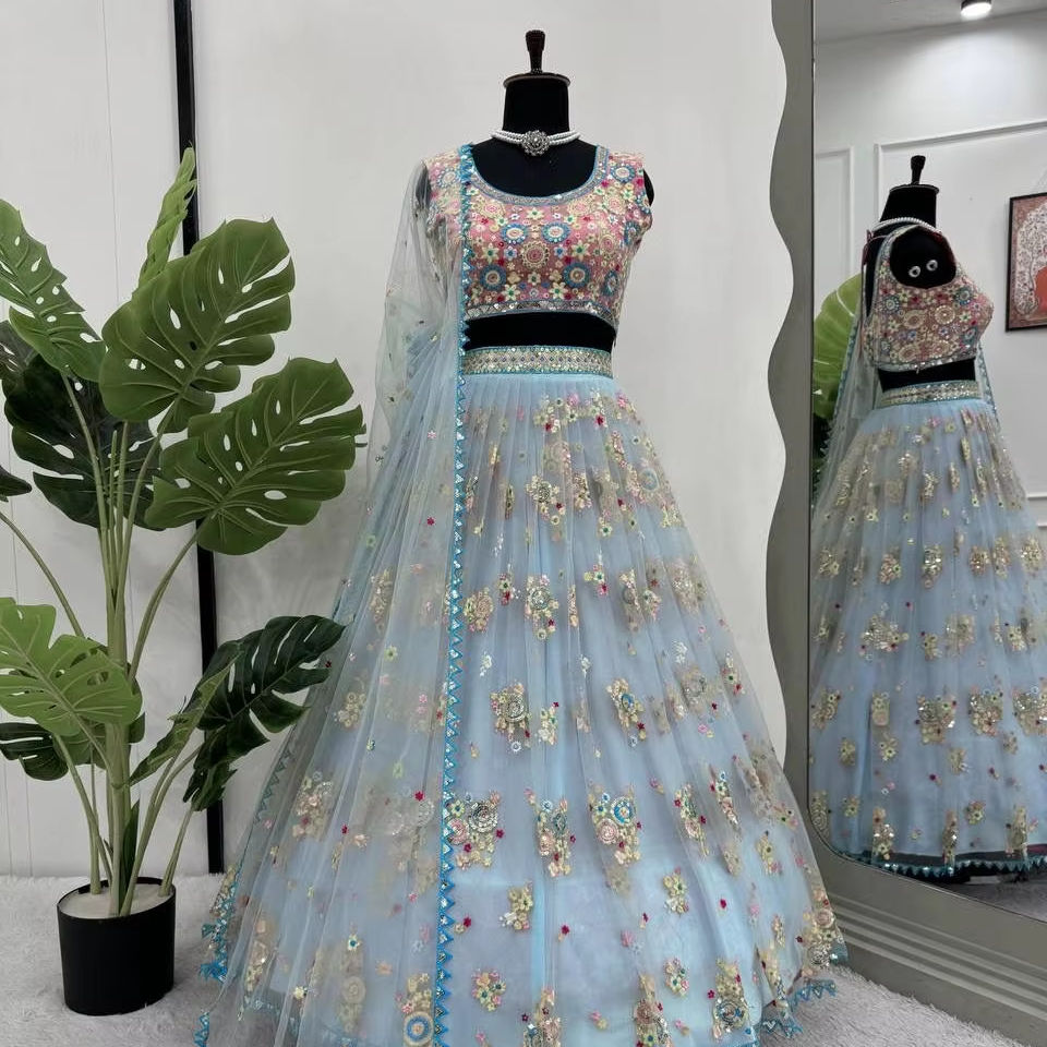 Lehenga y Choli con Dupatta Bordado de secuencia neta de mariposa