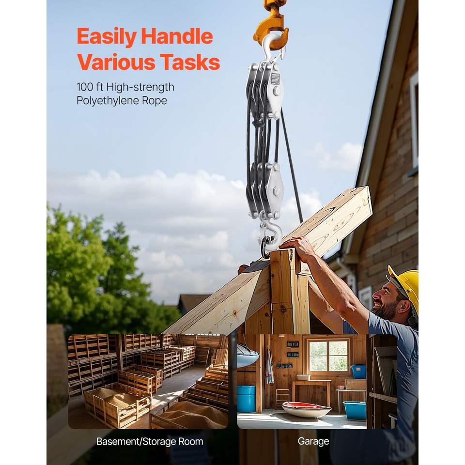 Sistema de Polea de Cuerda de Alta Resistencia de 100 Pies, 4400 Libras de Resistencia a la Rotura, Potencia de Elevación 5:1, 2 Lazos Suaves, 2 Ruedas Metálicas