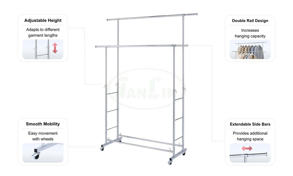 Perchero doble de alta resistencia con rieles laterales extensibles, maximiza la capacidad de colgado, diseño ajustable y extensible, perchero para ropa de Taiwán