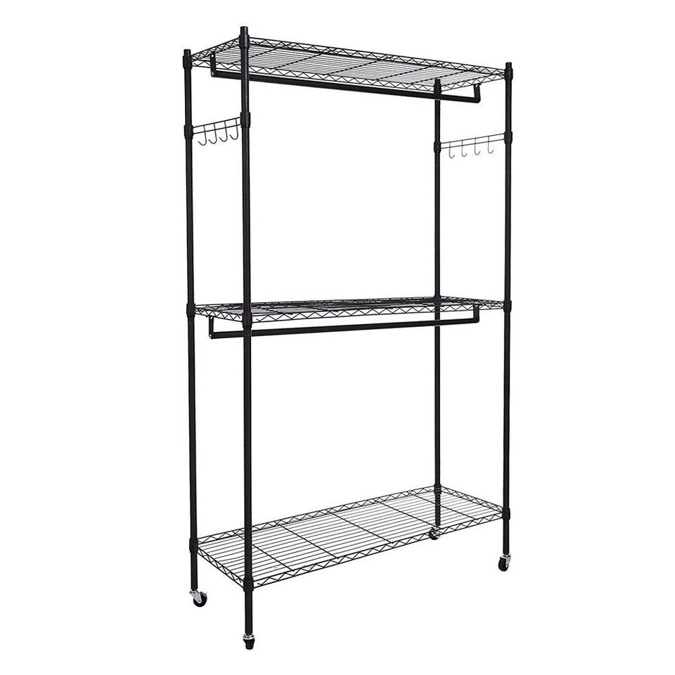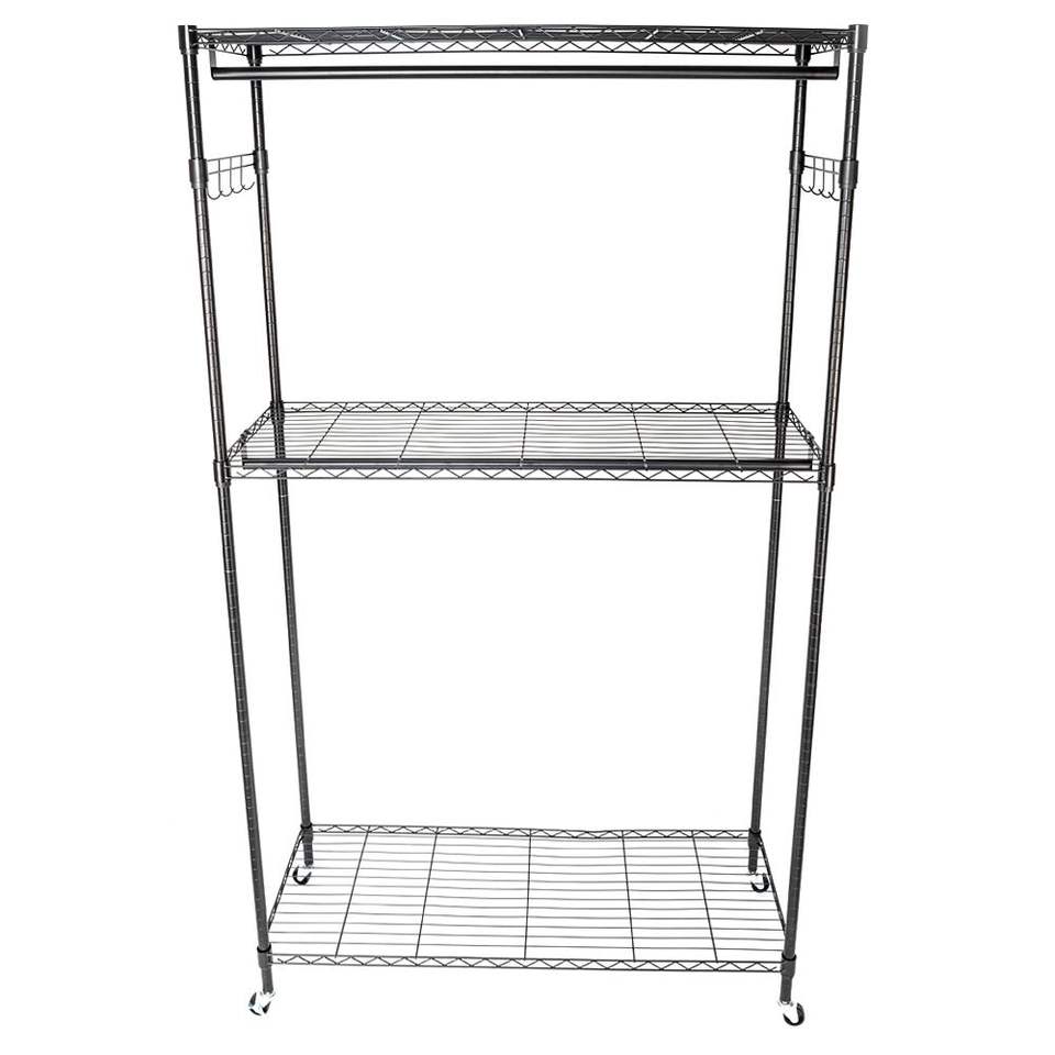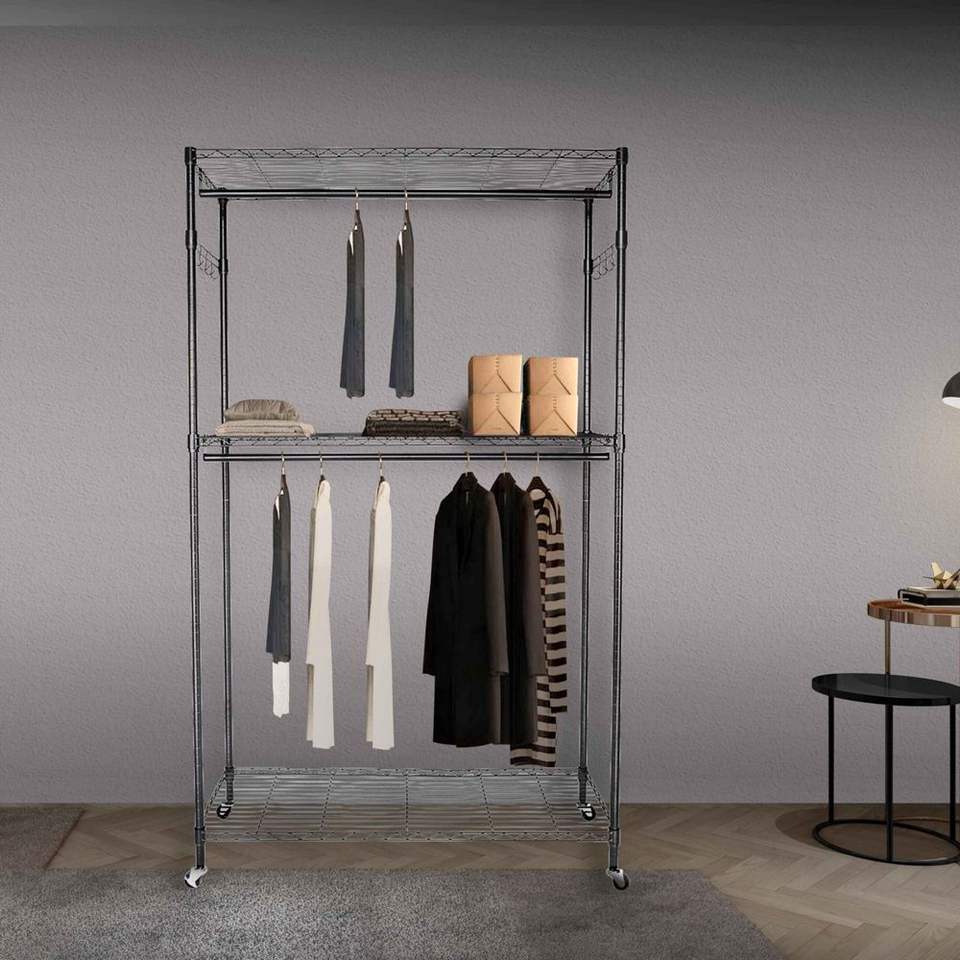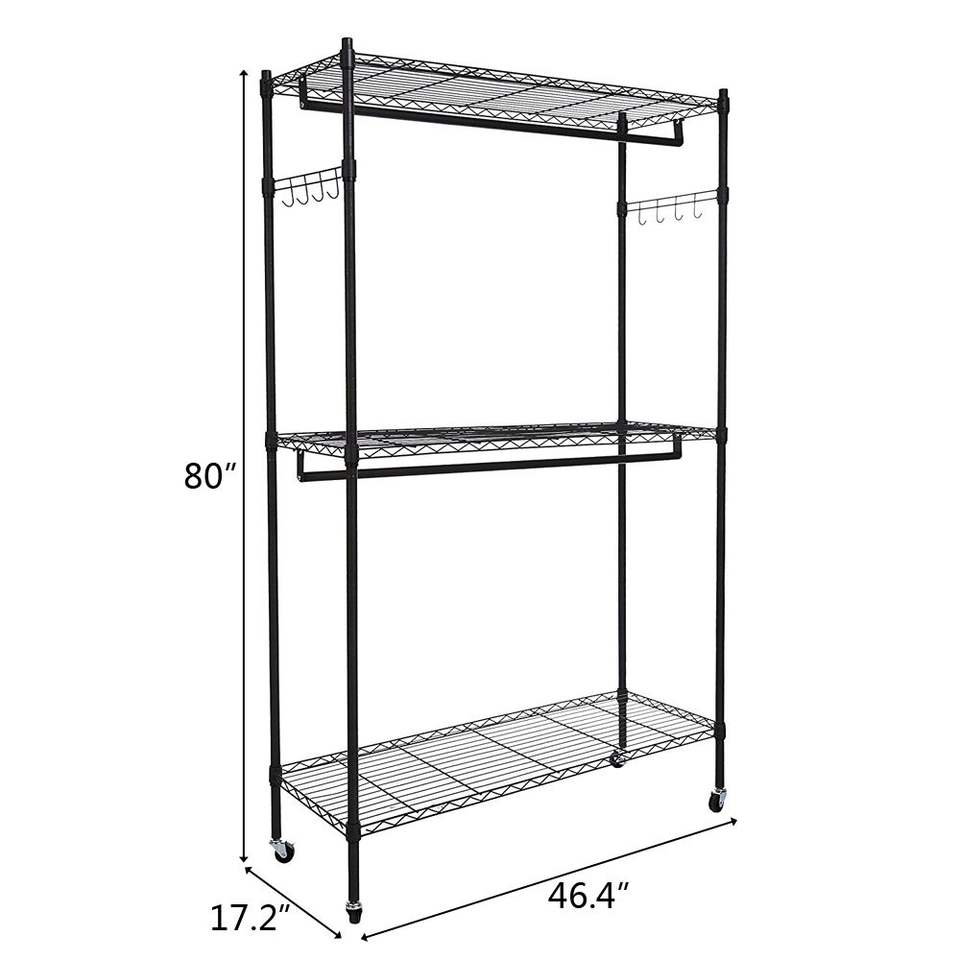 Perchero Resistente con Ruedas y Ganchos Laterales, Armario de Doble Barra, 3 Estantes de Alambre para Ropa y Mobiliario de Hotel