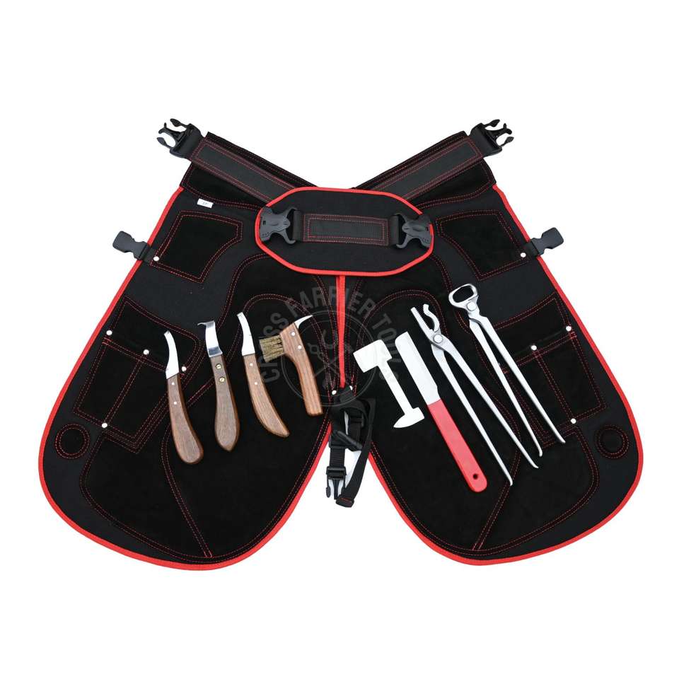 Palabras clave:Kit de herramientas de herrador, kit de recorte de pezuñas de caballo, delantal de herrador de cuero