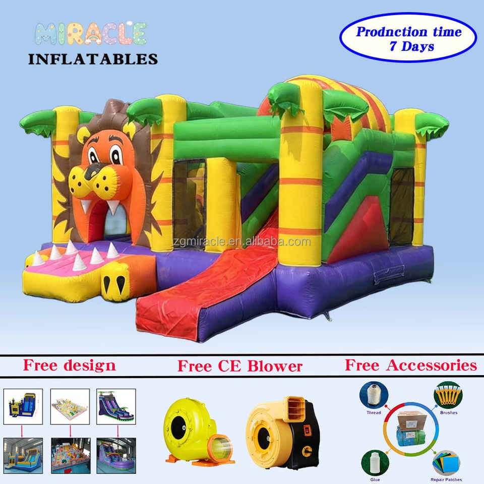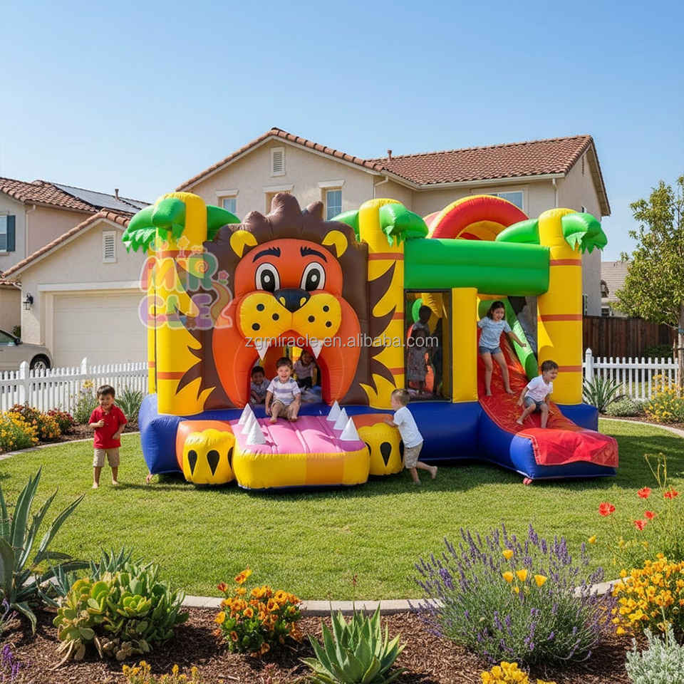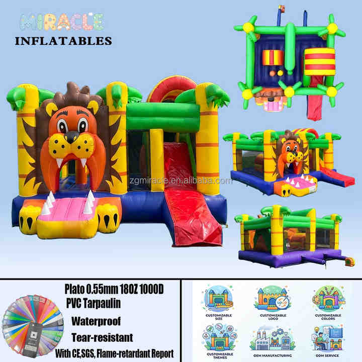 Castillo Inflable Resistente con Tobogán y Obstáculos, Diseño de León, para Uso Comercial