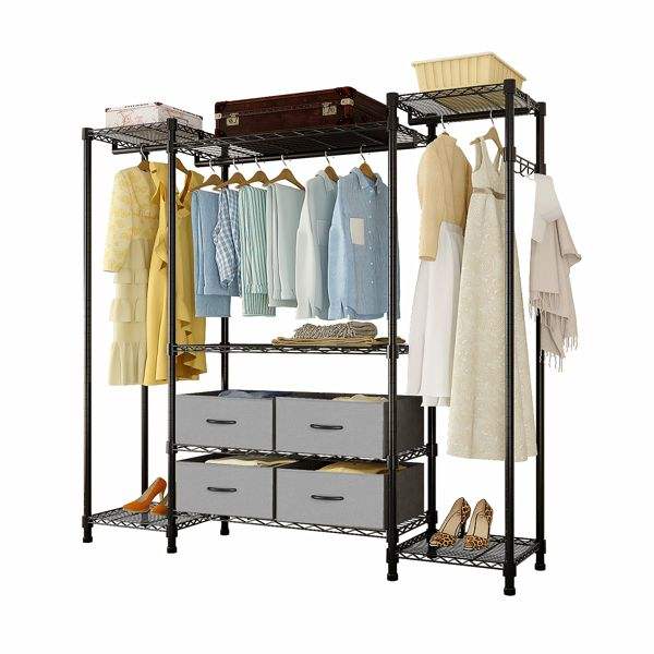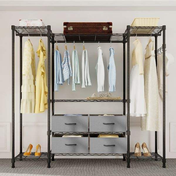 Perchero Metálico Resistente Portátil con Cajón de Tela, Sistema Organizador de Ropa para Armario Doméstico