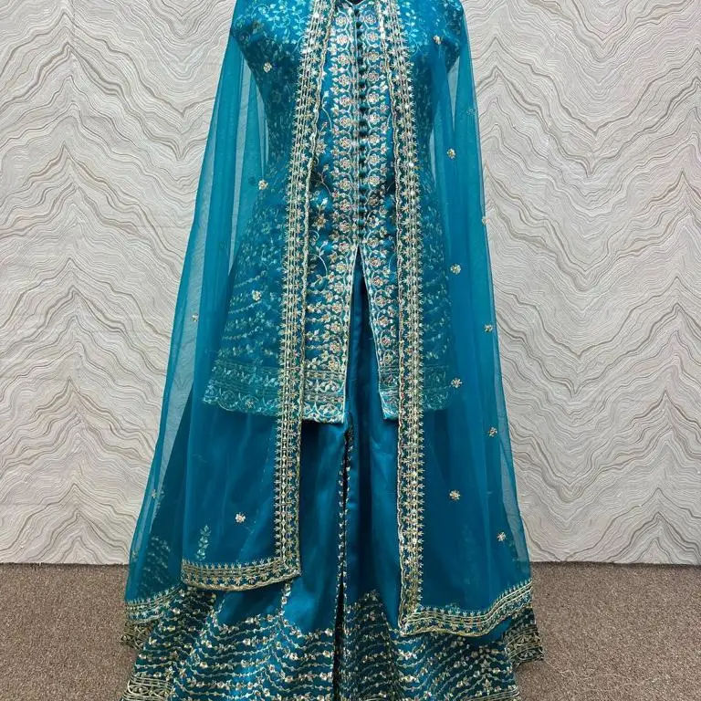 Georgette de imitación pesada con trabajo de secuencia de bordado pesado con trabajo hecho a mano de espejo real con menos borde con manga completa