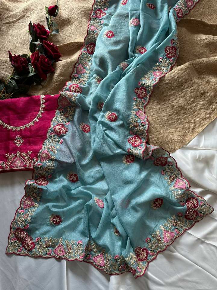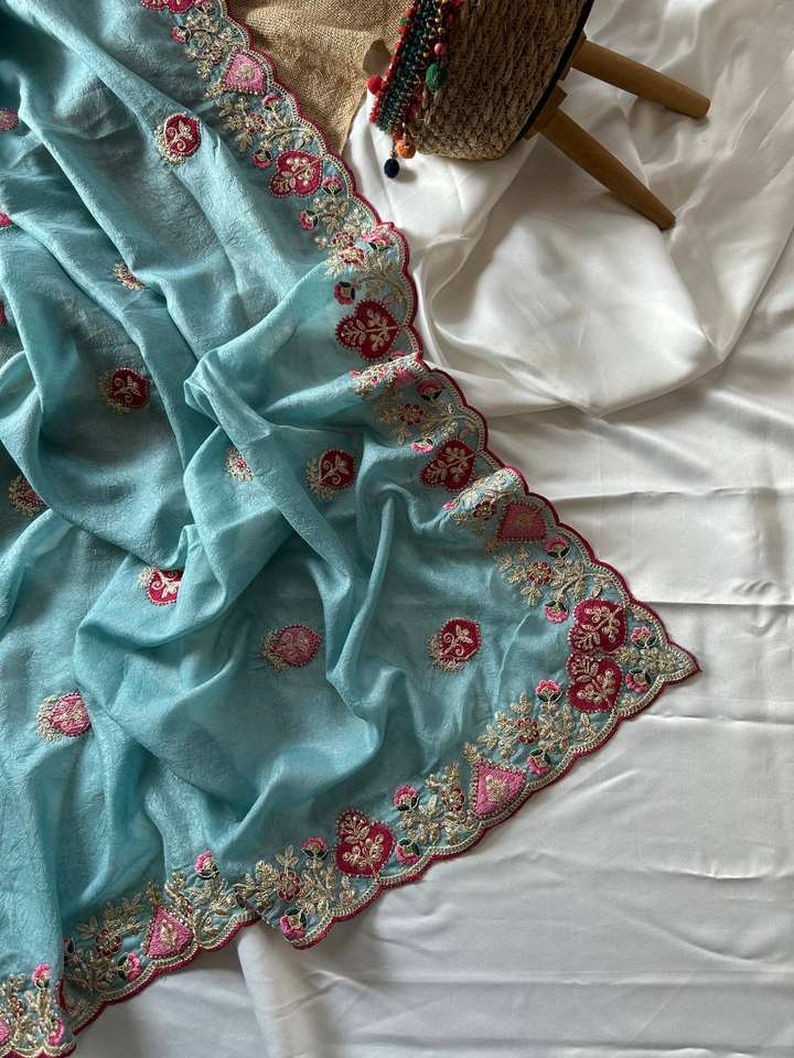 Sari de seda con bordado indio elaborado y ribete de encaje para damas, ideal para fiestas.