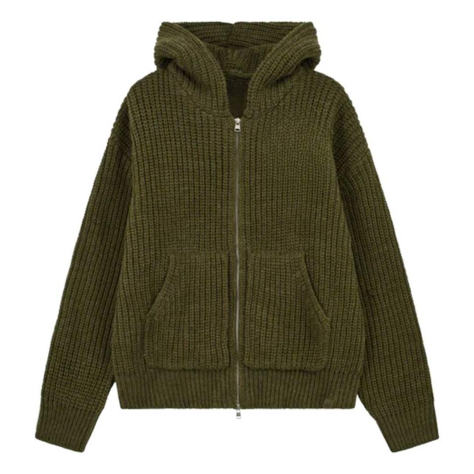 Sudadera con capucha de punto acanalado grueso con cremallera completa para hombre, color caqui, de primera calidad, para uso casual