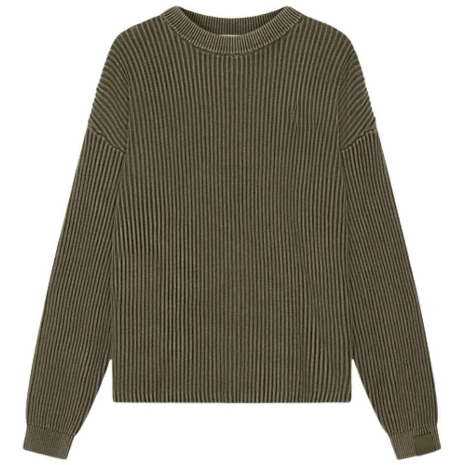 Suéter de punto acanalado lavado de cuello redondo color caqui para hombre, elegante jersey de punto acanalado con detalles acanalados, ajuste casual