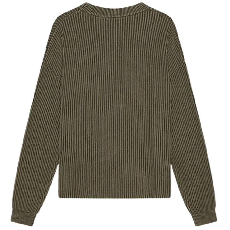 Suéter de punto acanalado lavado de cuello redondo color caqui para hombre, elegante jersey de punto acanalado con detalles acanalados, ajuste casual