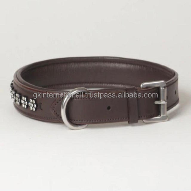Collar para perro de cuero marrón con relleno suave, costura completa resistente, cristales de diamantes de imitación y hebilla de pin de acero inoxidable, anillo D