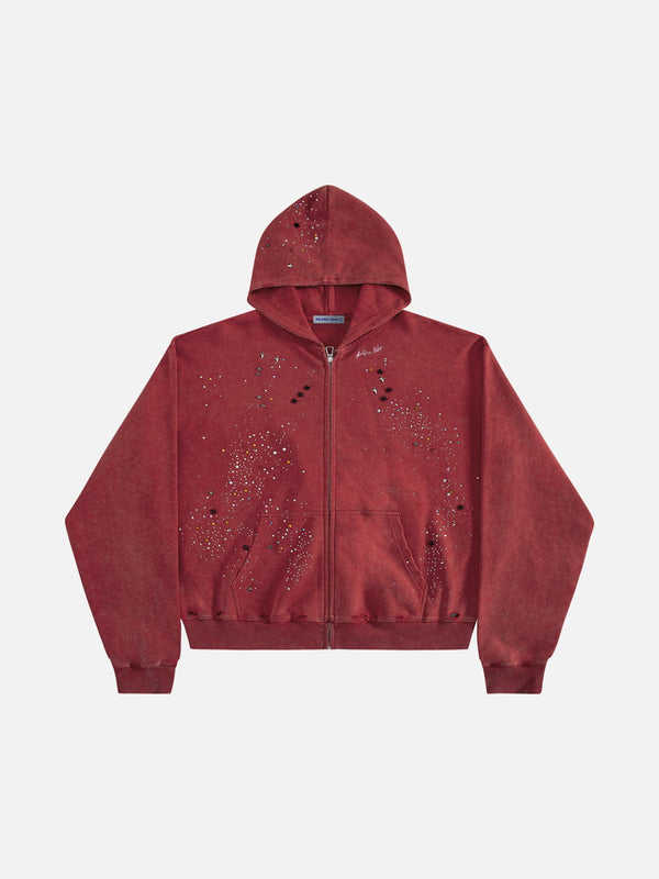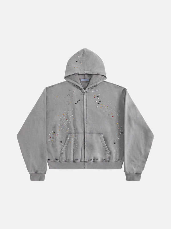 Sudadera con capucha corta de algodón grueso con forro polar, diseño de estrellas de pedrería, con cremallera, estilo vintage, lavado ácido, oversize, streetwear