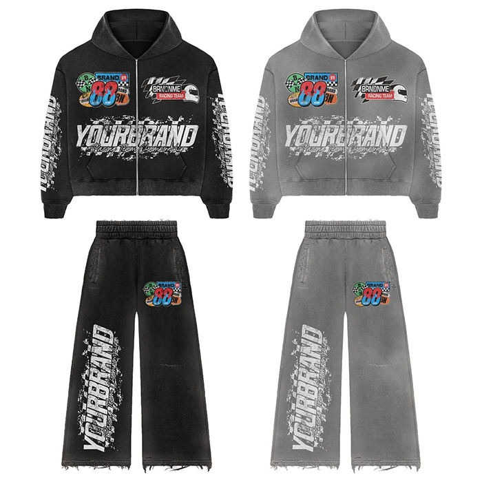Chándal pesado de talla grande para hombre, chándal con capucha y pantalones de chándal con estampado de logotipo personalizado y lavado ácido con cremallera, conjunto para hombre, chándal